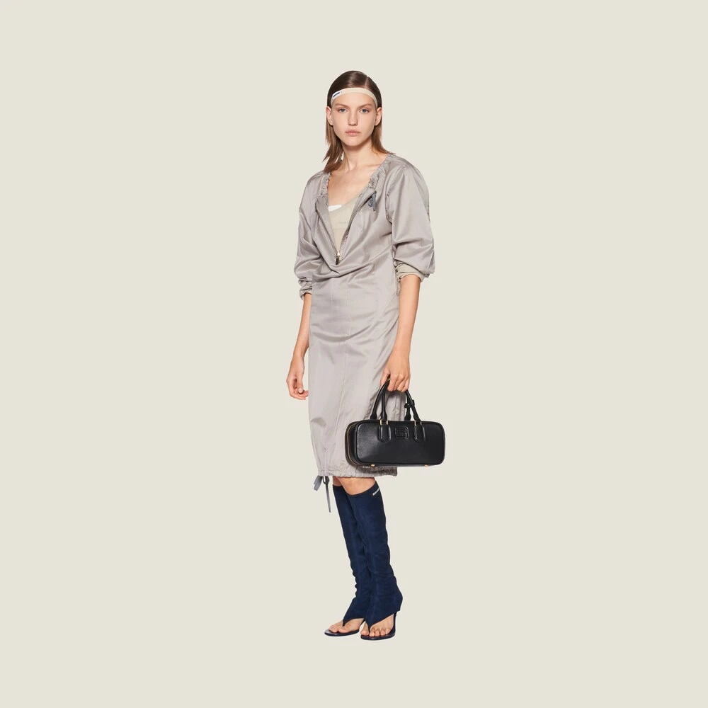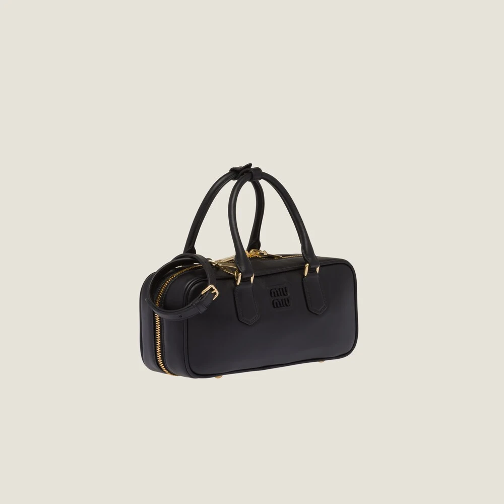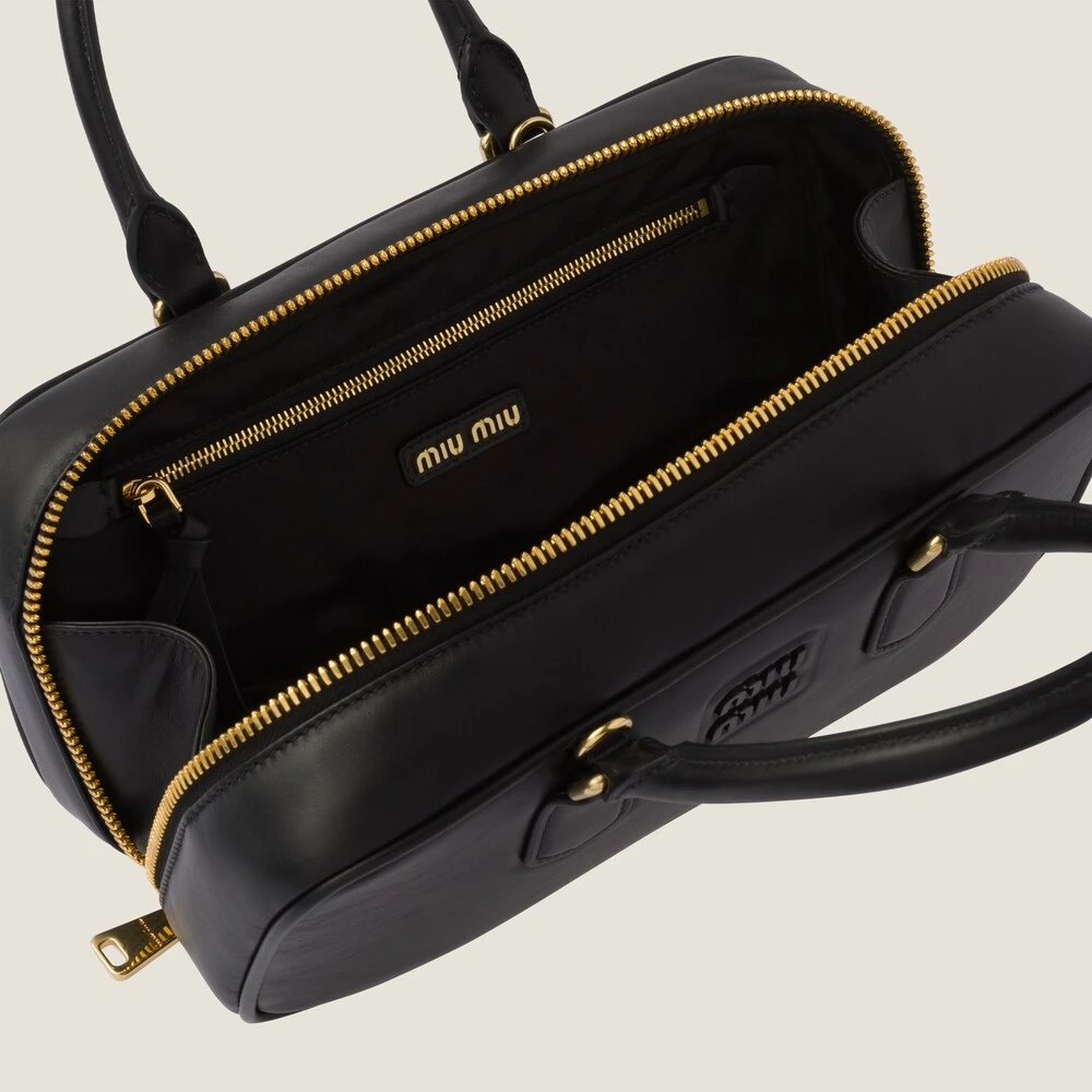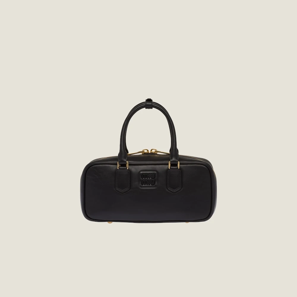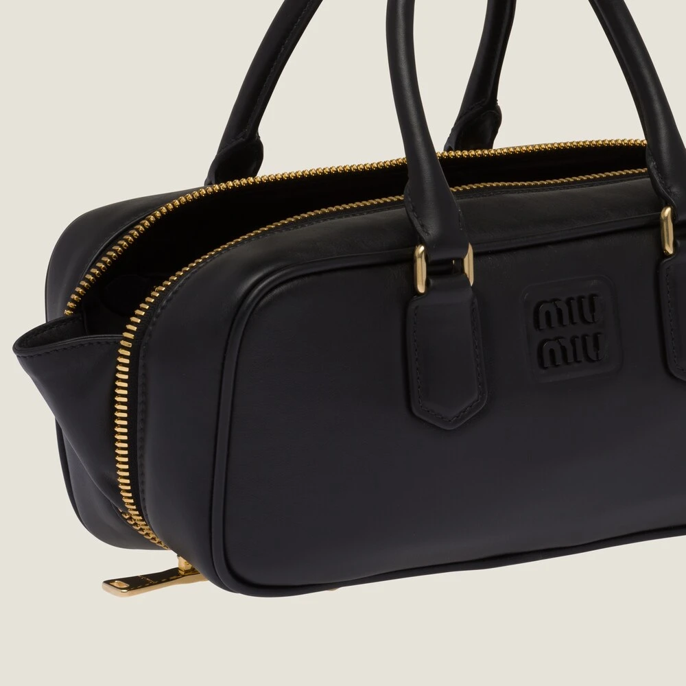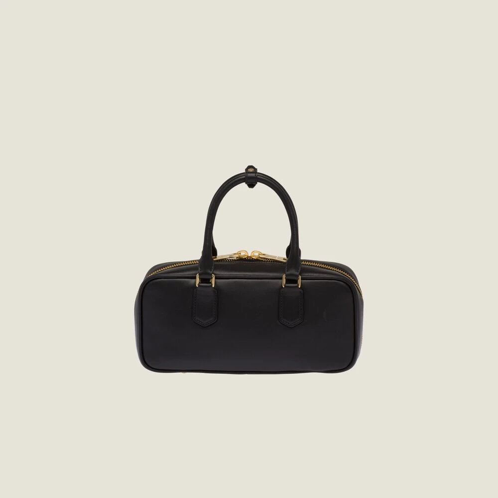 This leather top-handle bag expresses a notion of fashion as a means of translating a reaction to current reality into material form. The light padding gives the bag a voluminous look and a cosmopolitan style. The lettering logo, which echoes the finishes of the metal hardware, crosses the boundaries between function and decoration and helps to define the distinctive and iconic aesthetic of the top-handle bag.