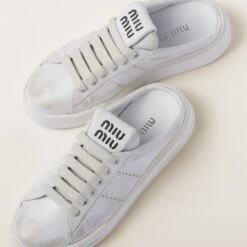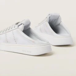 The irreverent and unconventional suggestions from Miu Miu’s stylistic universe reinterpret the classic lines of sneakers from an innovative perspective. The open back and bleached leather give the footwear an original design while the contrasting screen-printed logo stands out on the tongue and completes the shoe with an iconic note.