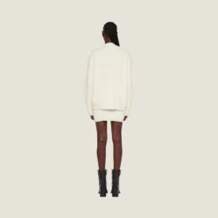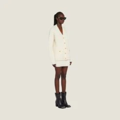 Conveying a sense of subtlety and intimacy, the knitwear items in the new Miu Miu collection are the epitome of romanticism and modernity. Exquisite yarns and an oversized silhouette are features of this stitched bouclé cardigan.