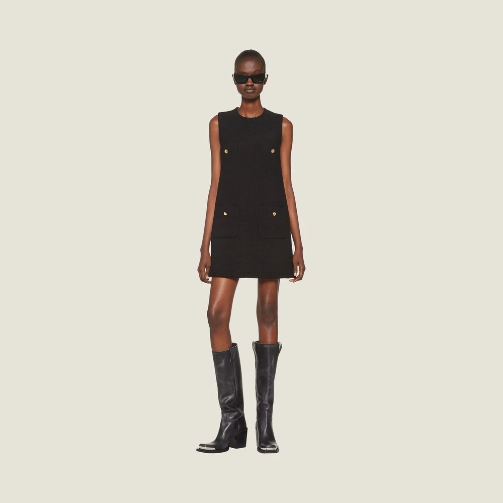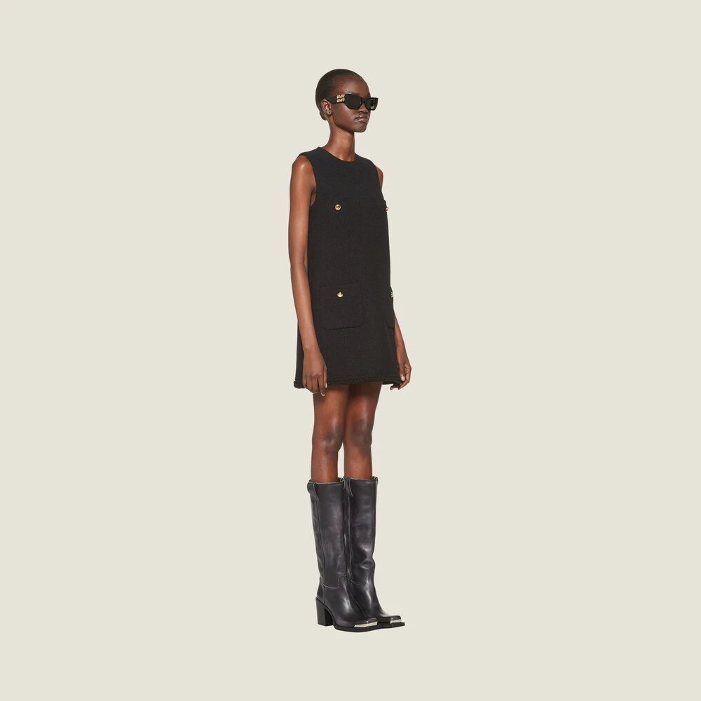 A minimalist design and precious details reinterpret a classic silhouette of womenswear. This bouclé mini-dress is decorated with braided knit trim on the hem.