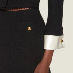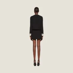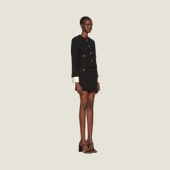 This bouclé mini skirt offers a clean, minimalist, simple design, featuring front pockets and buttons, with a romantic style.