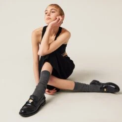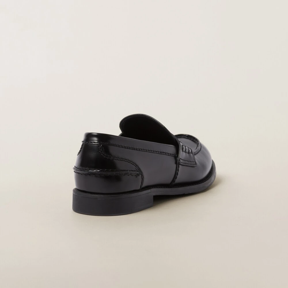 In the ’50s, loafers were part of school uniforms worn by U.S. prep school and college students. Annoyed by having to wear a uniform, students started inserting a shiny penny in the slot of the leather band, giving rise to the name “Penny Loafers”. Miu Miu gives this timeless footwear synonymous with tradition an update in a brushed leather version.