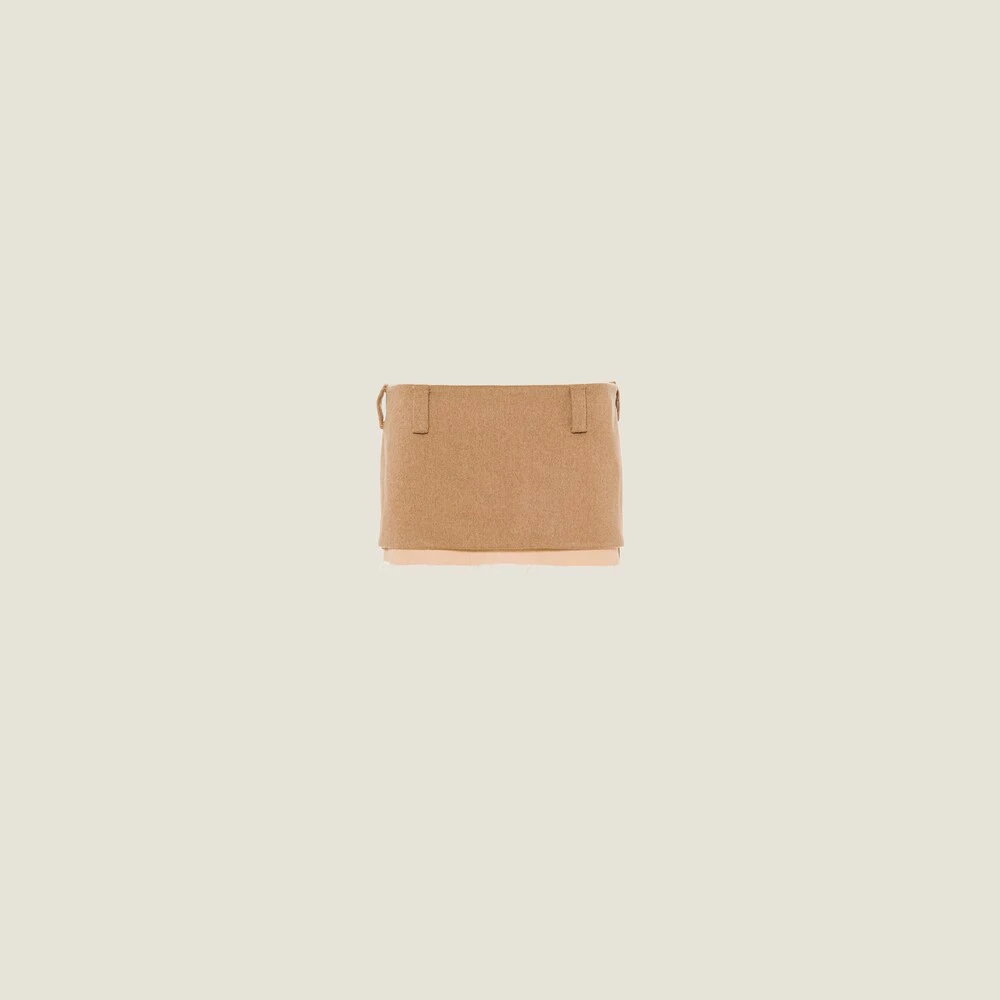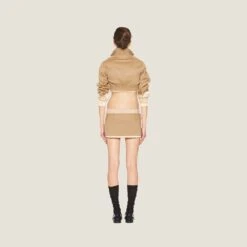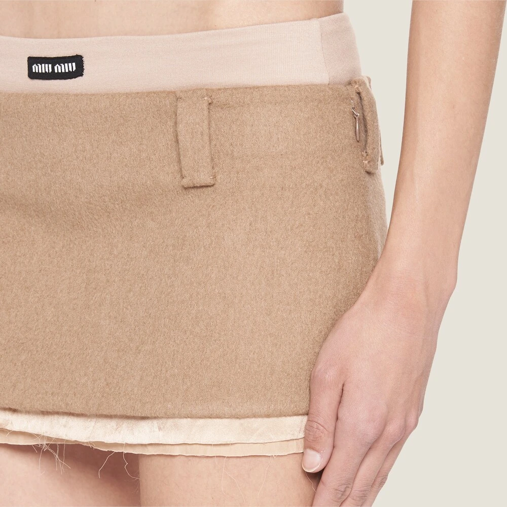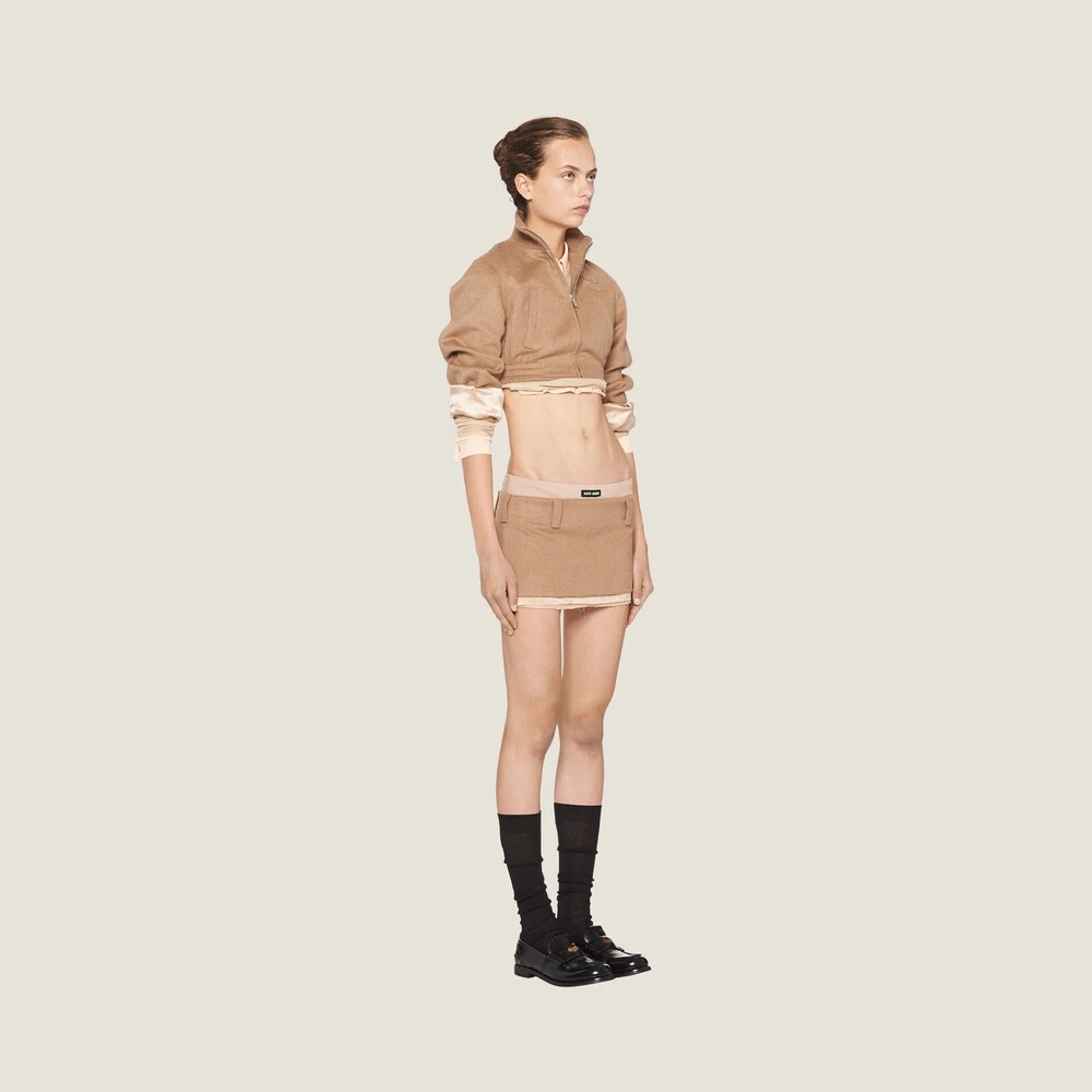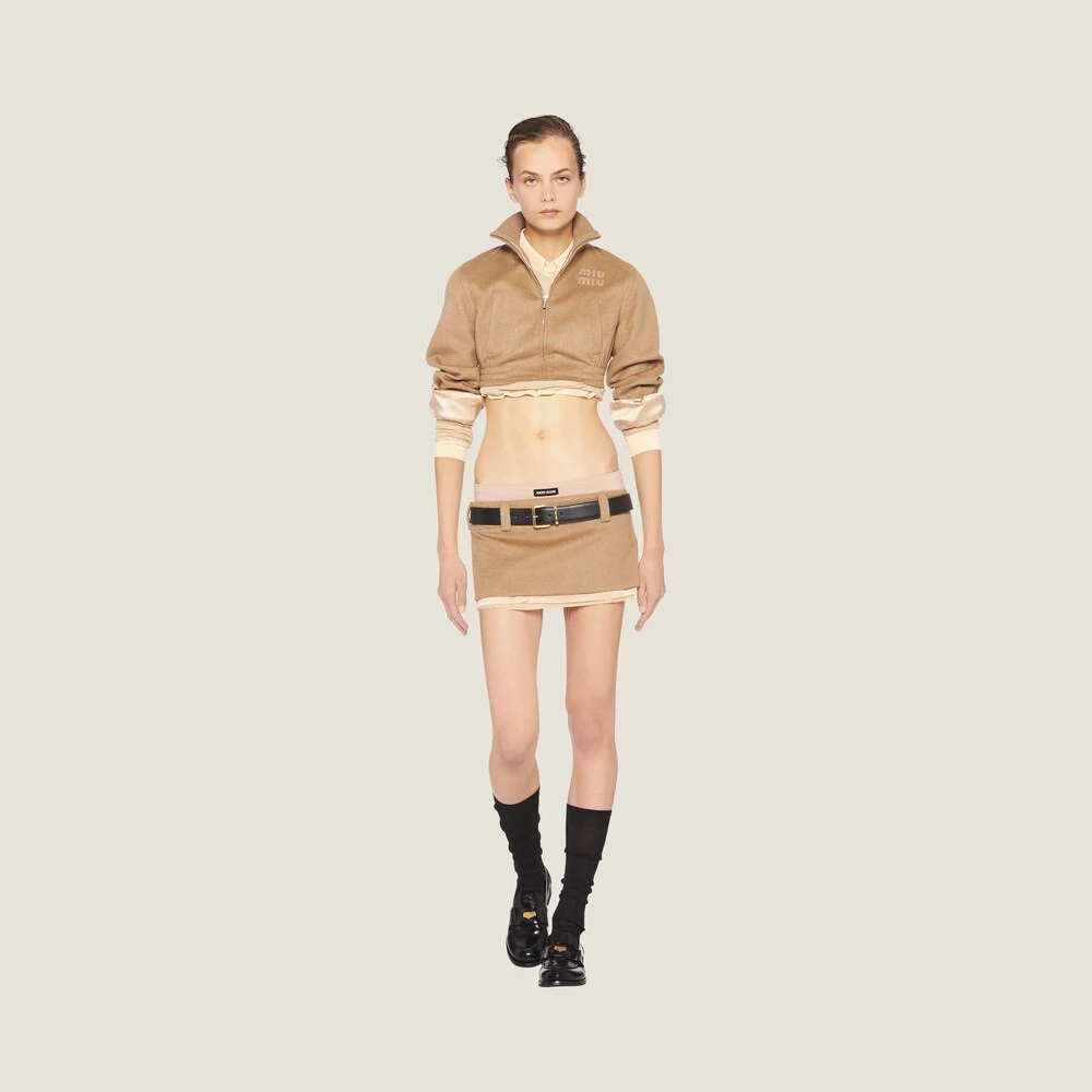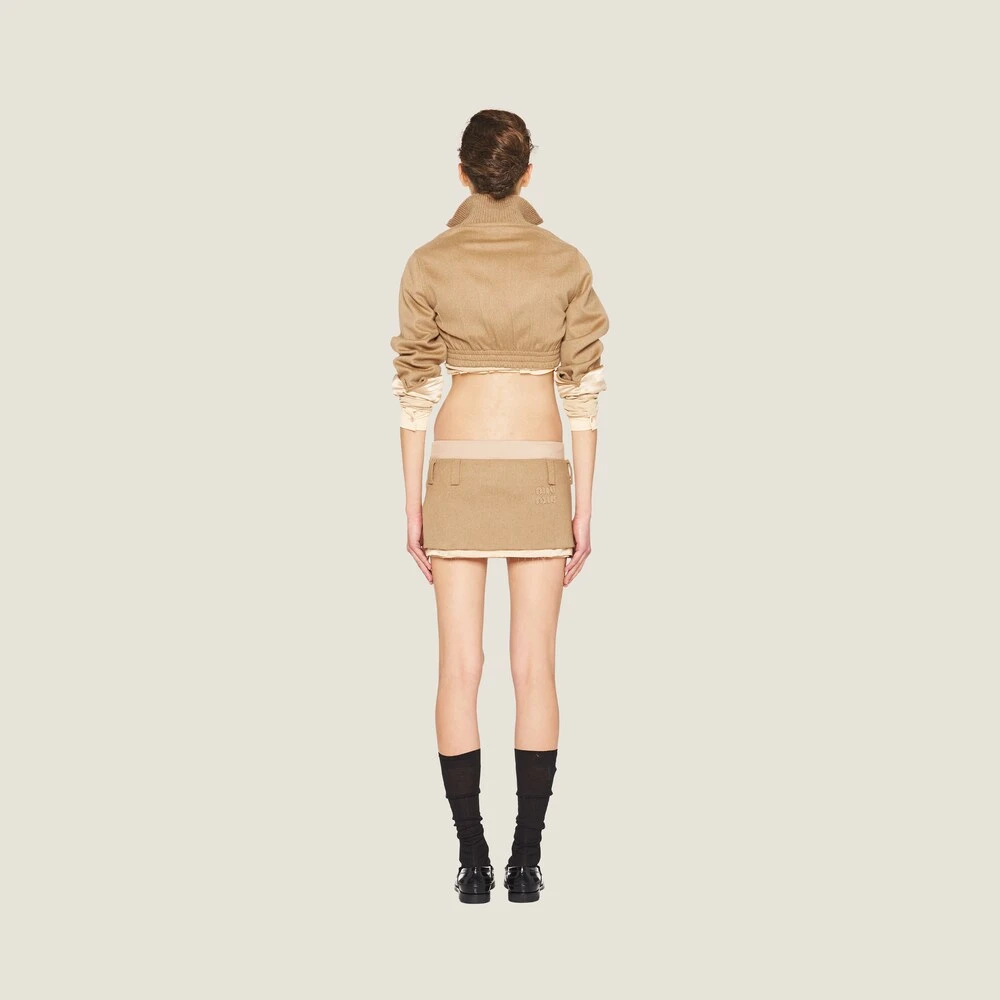 Classic menswear fabrics are renewed in new irreverent and ultra-feminine silhouettes. The embroidered Miu Miu logo adds an iconic note to this miniskirt.