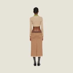 Classic menswear fabrics are renewed in new irreverent and ultra-feminine silhouettes. The embroidered Miu Miu logo adds an iconic note to this pencil skirt with a belt at the waist.