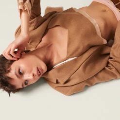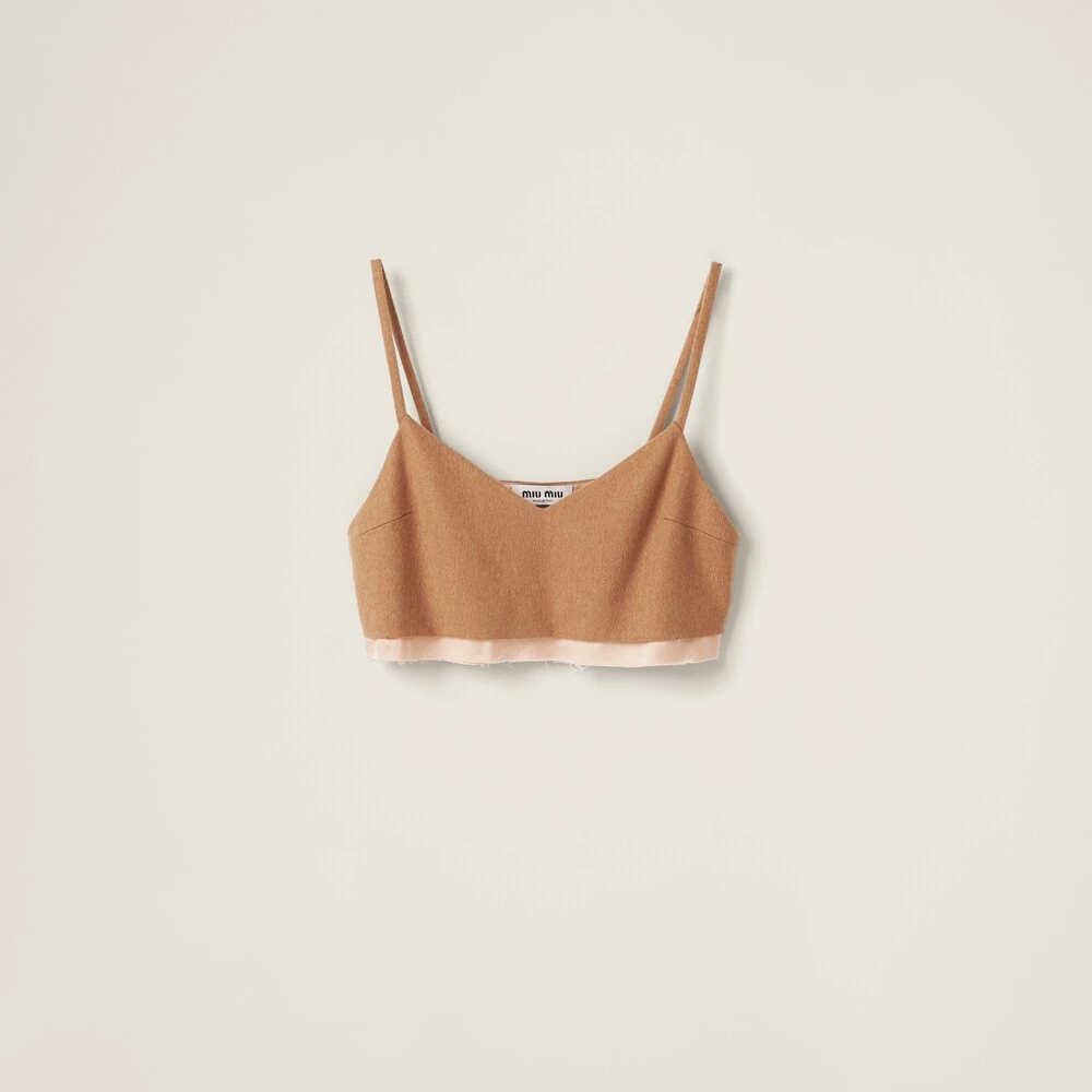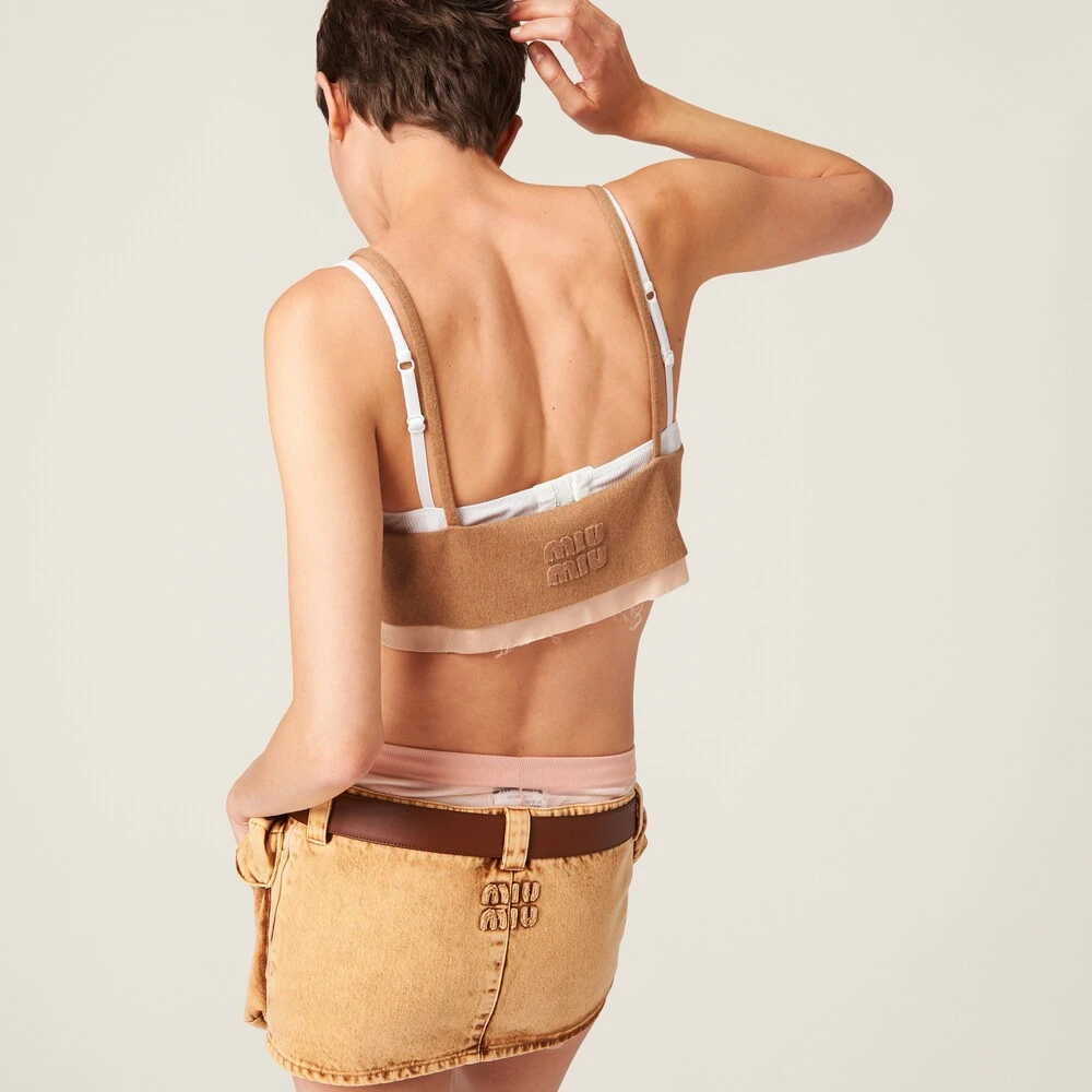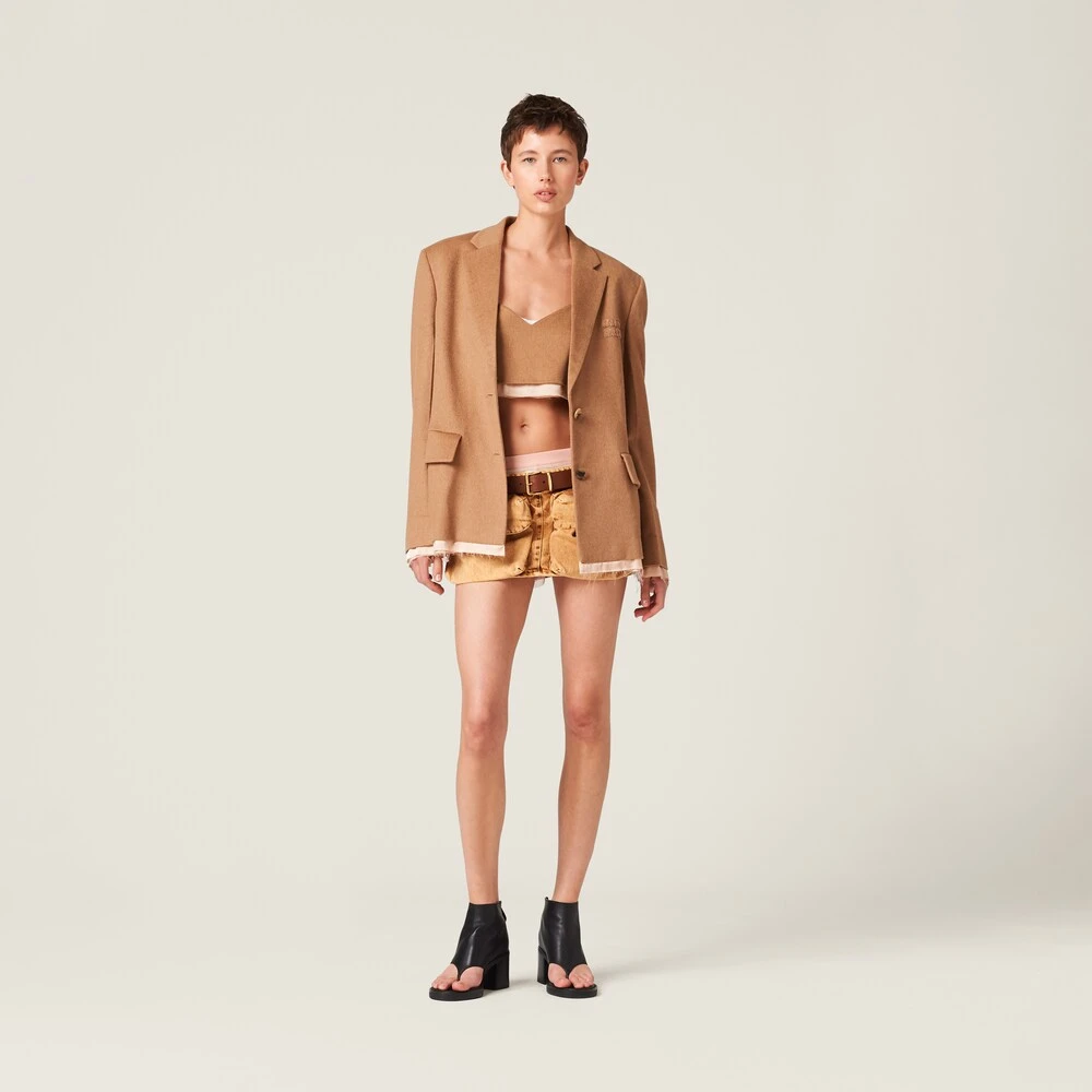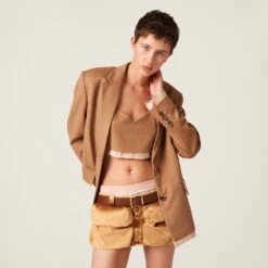 Present on the catwalk during the Spring-Summer 2023 show, the new camel top expresses a concept of fashion as a means of translating a reaction to reality into material form. The layering of fabrics, colors, and styles — in this case, that of a top that meets the lingerie world — animates surfaces, underscoring the notion that each concept, in its translation, mutates to take on a new form and a different truth.