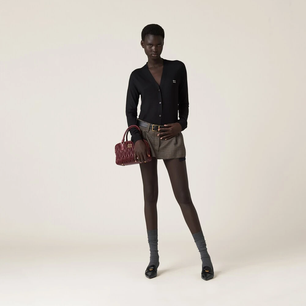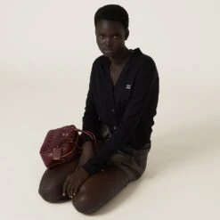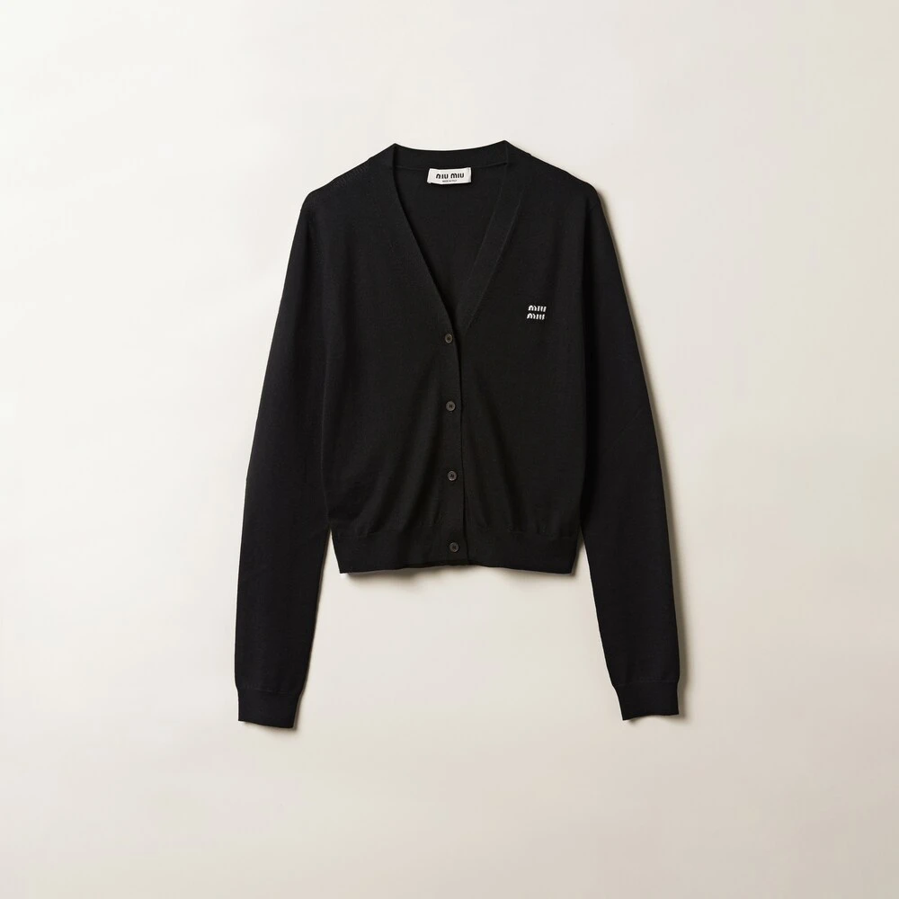 The soft feel of cashmere and silk is combined with Miu Miu’s refined style in this cardigan. — The intarsia logo stands out against the sleek lines of the garment, completing the look with a refined iconic note.