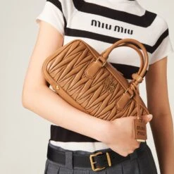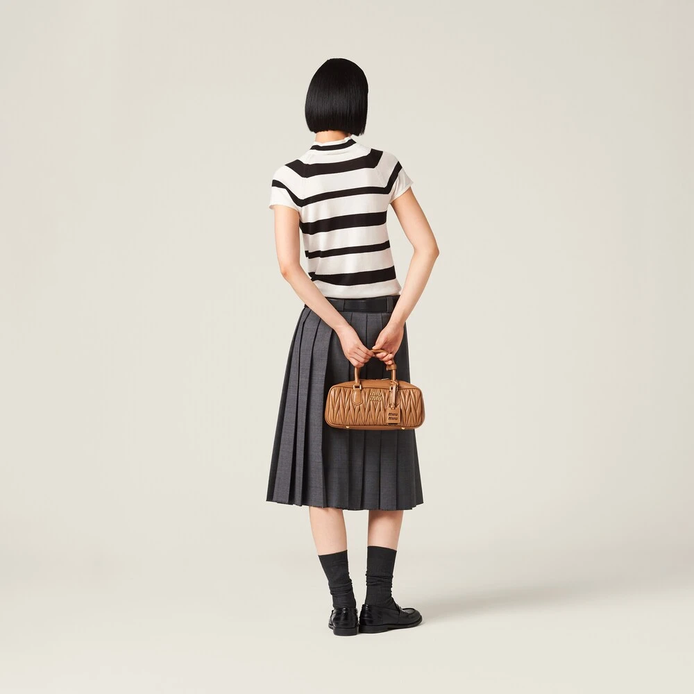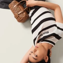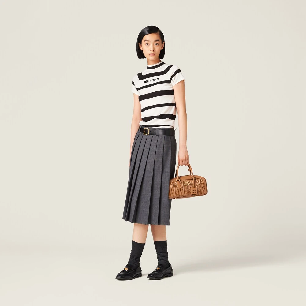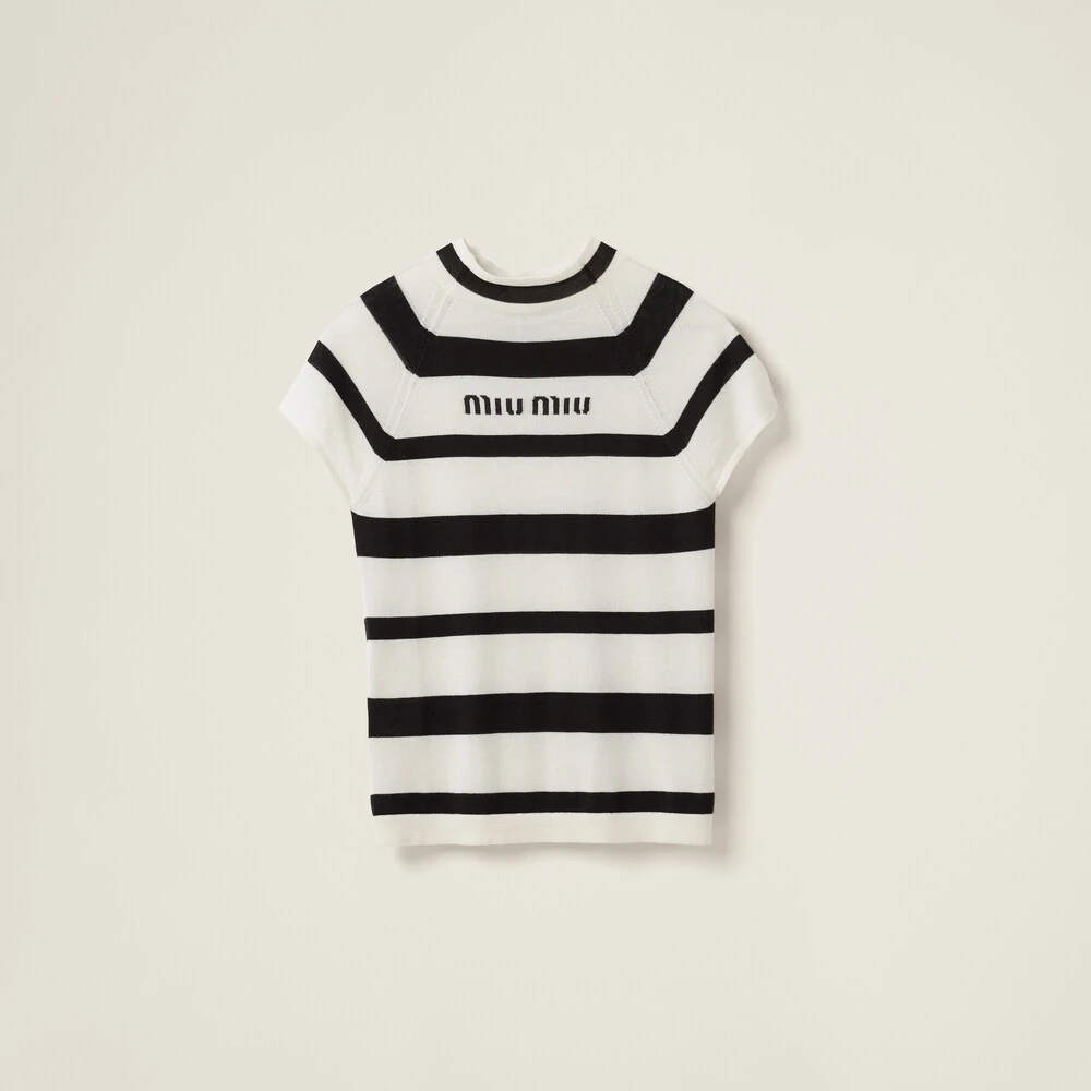 The world of stripes meets Miu Miu’s provocative character in the new cashmere and silk turtleneck. The slim fit is accompanied by ribbed knit trim. The tonal intarsia logo completes the design with an iconic note.