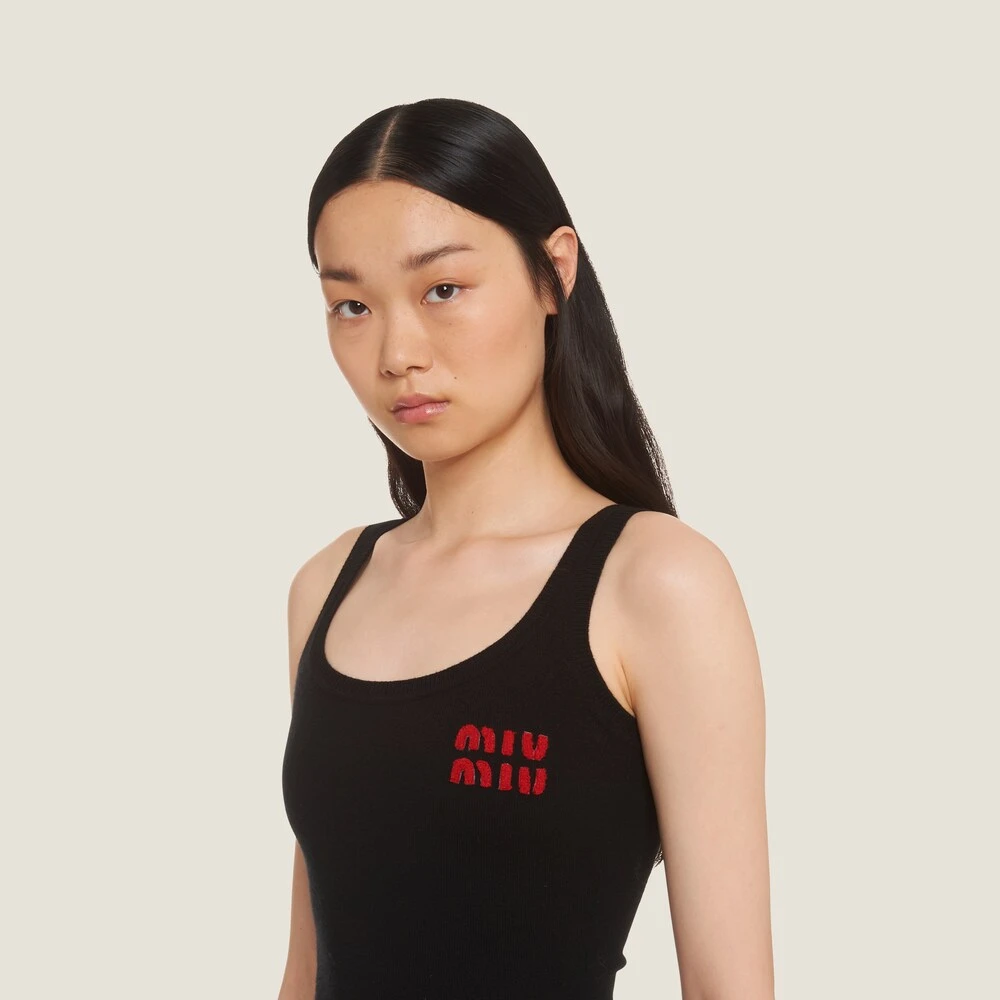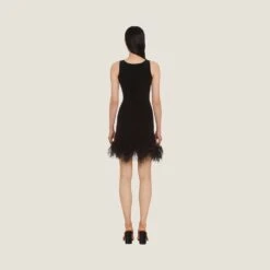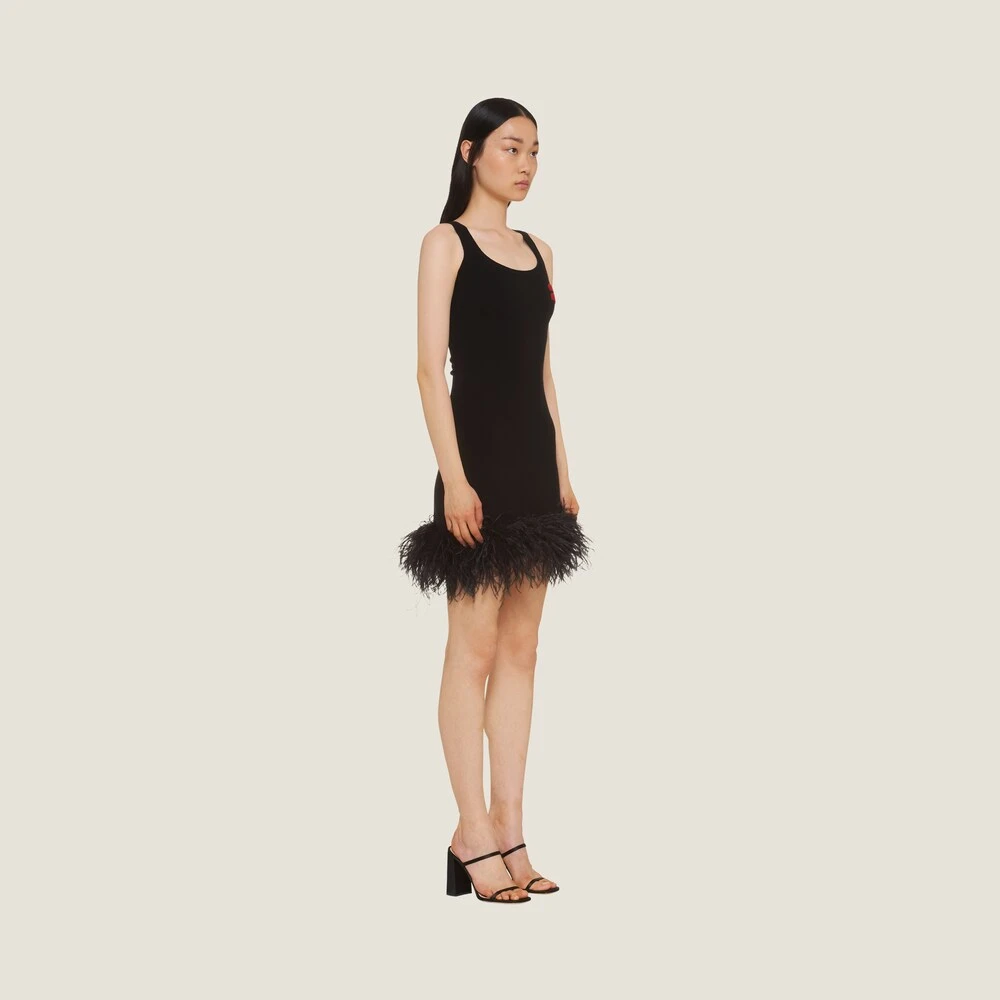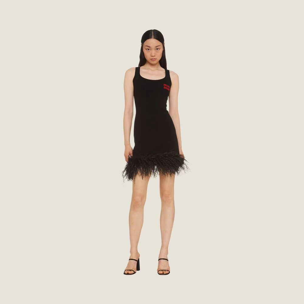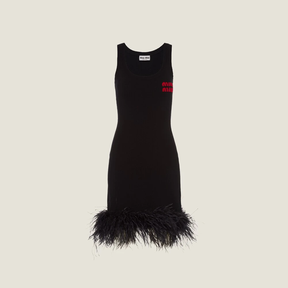 A play of feathers livens up this cashmere mini dress. Miu Miu brings to life a knitwear collection in exquisite yarns and amusing designs.