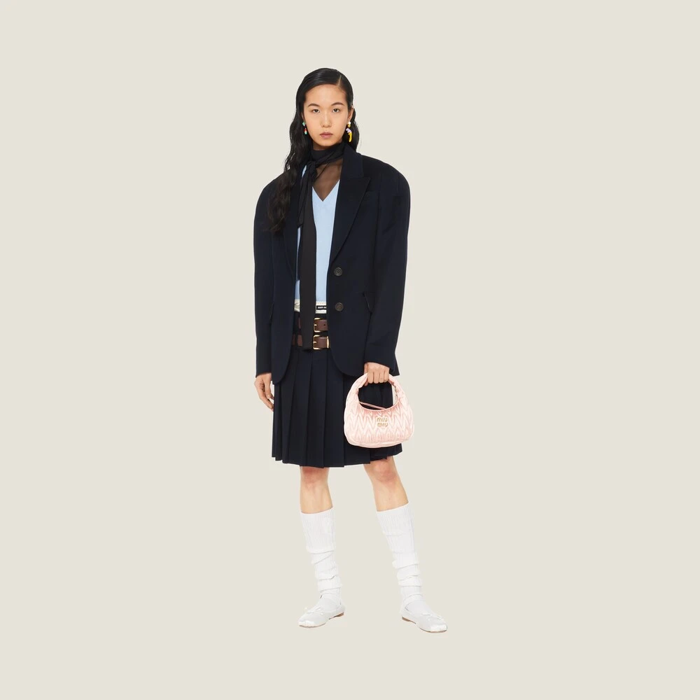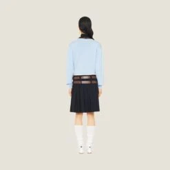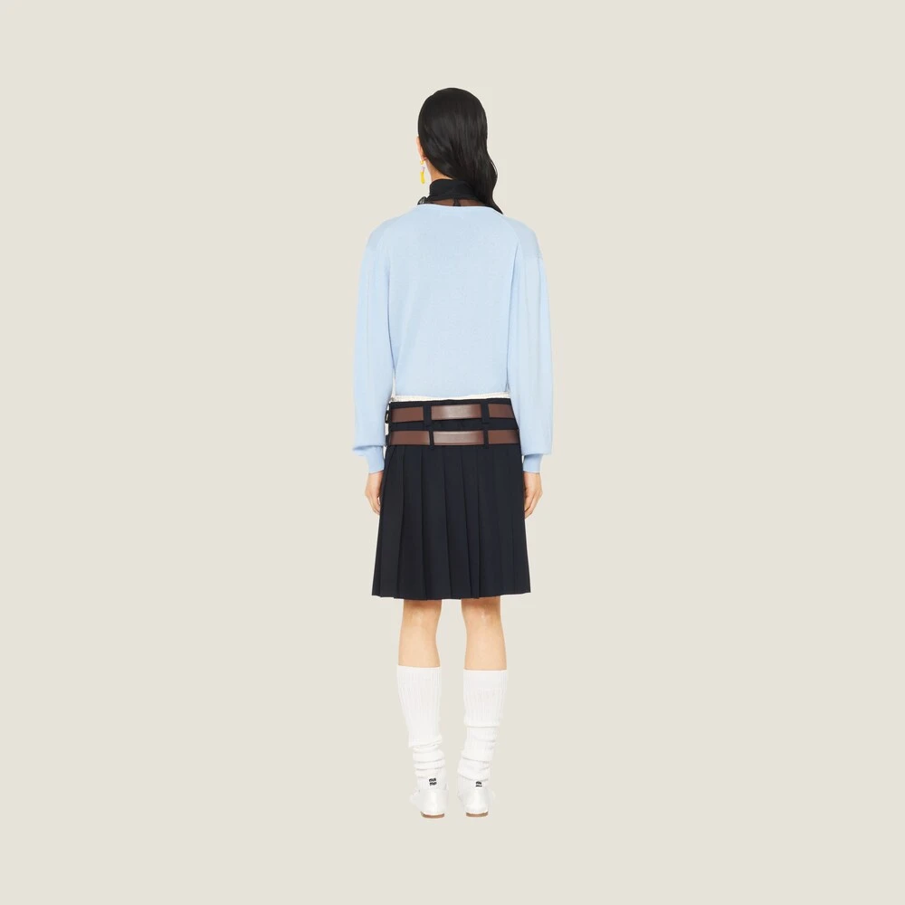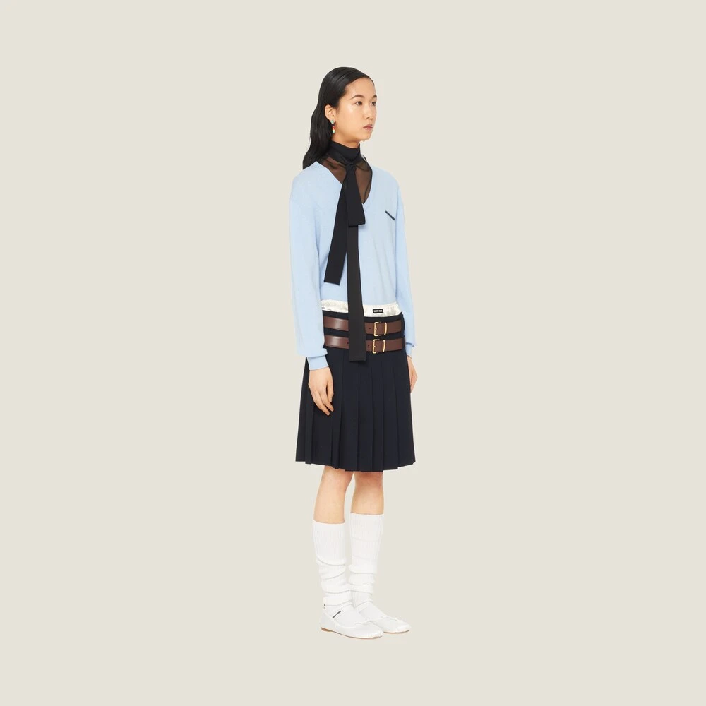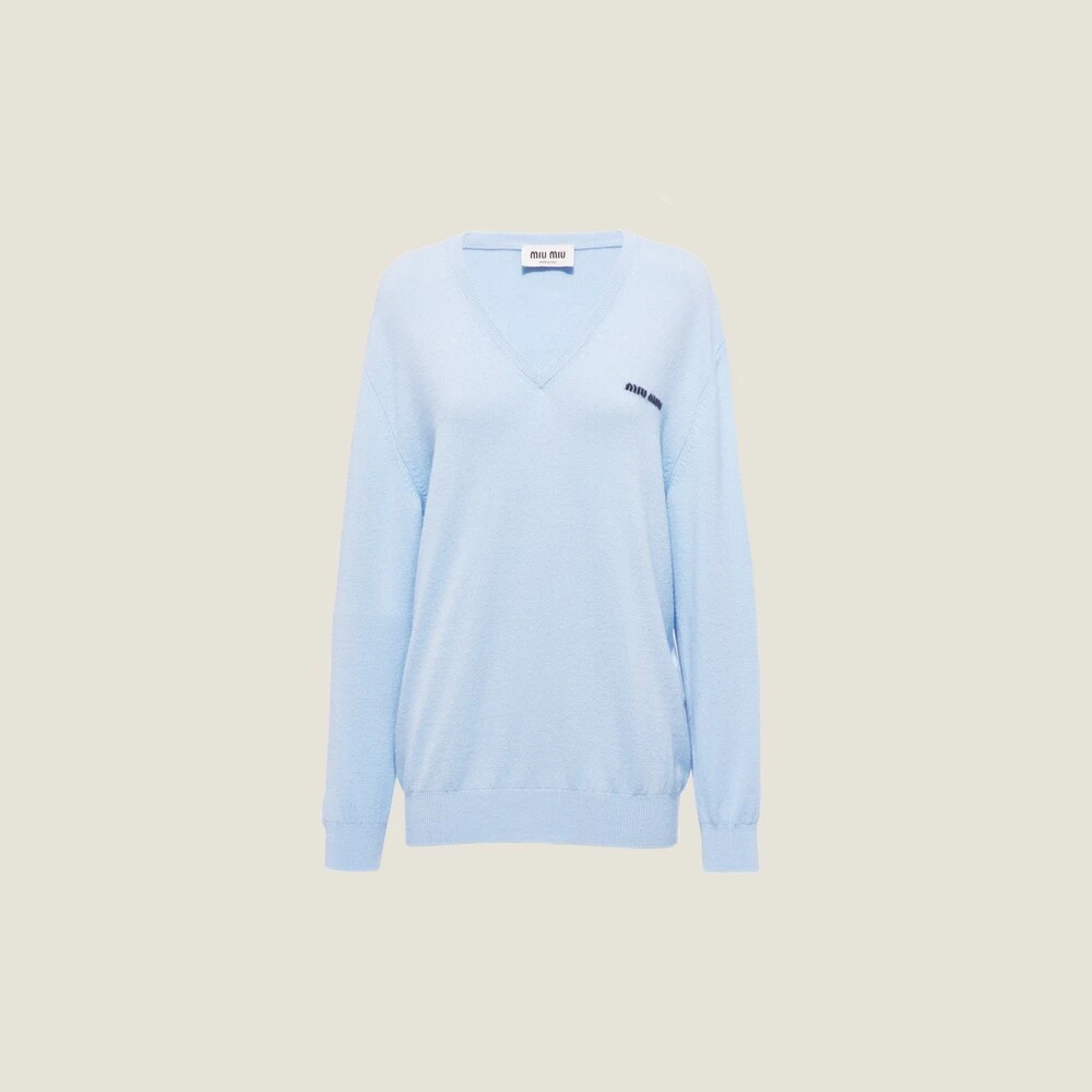 Fine yarns and refined workmanship in a plain knit distinguish the Miu Miu knitwear collection for the new season. The cashmere sweater with plunging V neck is embellished with the fine intarsia logo.