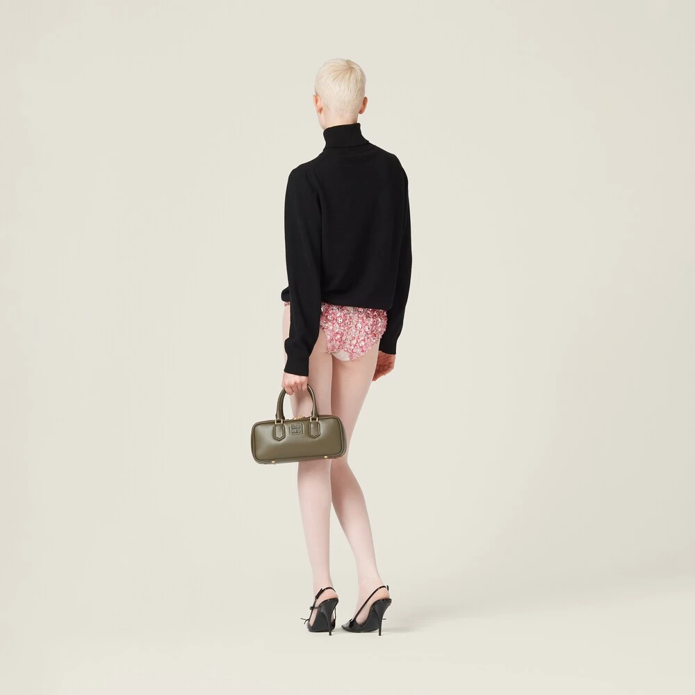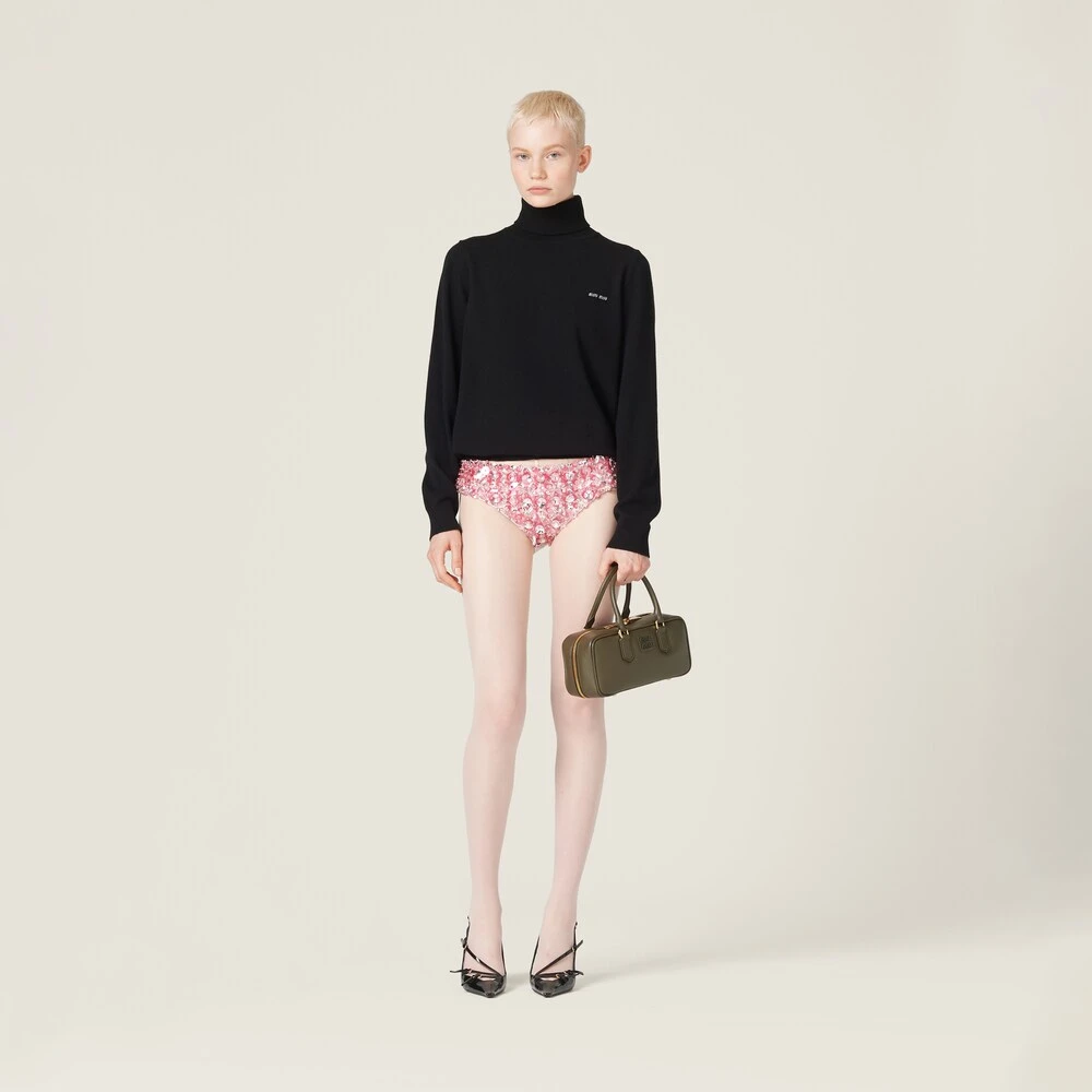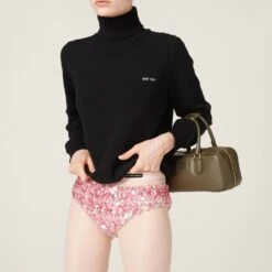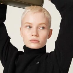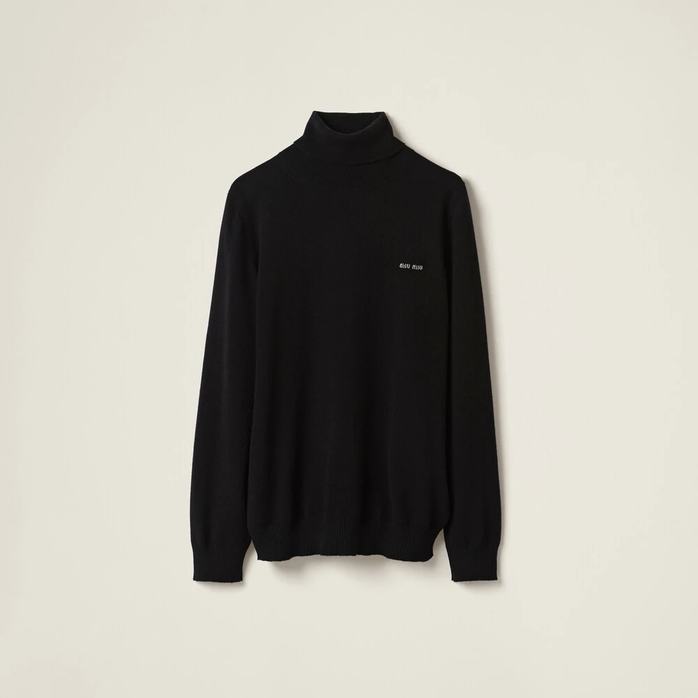 The minimalist style of this cashmere sweater is enriched by the Miu Miu logo that introduces a chromatic contrast and gives an iconic touch to the garment. The sleek lines make the garment versatile.
