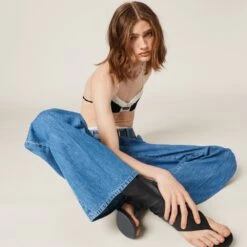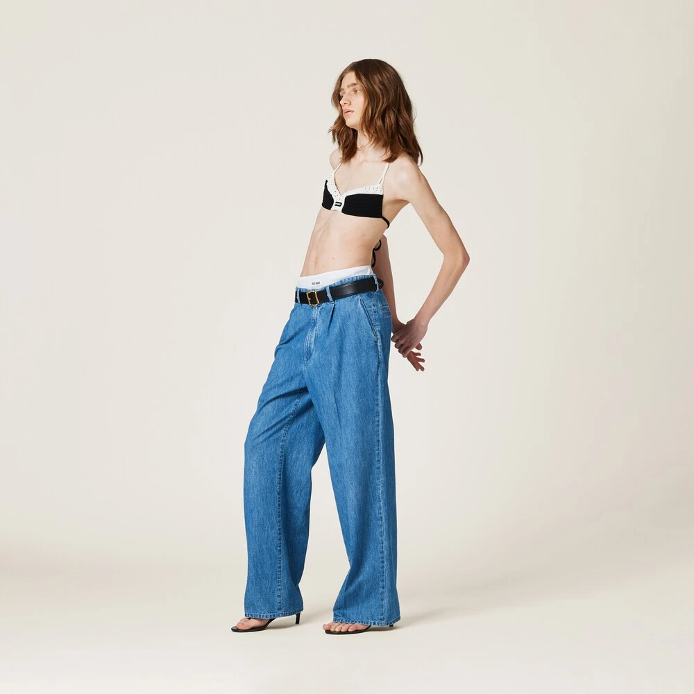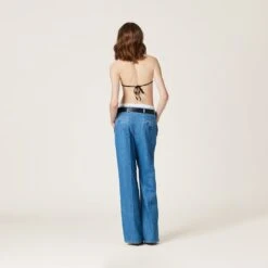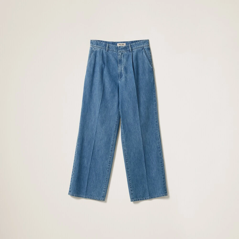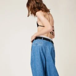 Streetwear style and sartorial references meet in these chambray denim pants. The pleats and back welt pockets, borrowed from classic menswear, coexist with the oversized lines and casual character of denim. The embroidered logo on one of the back pockets completes the aesthetic with a refined contrast and unexpected distinctive note.