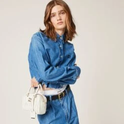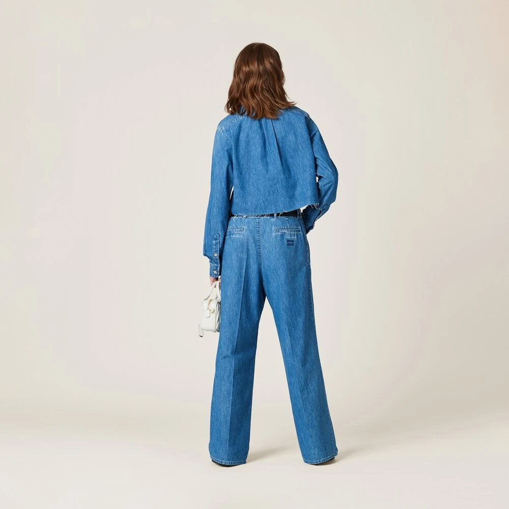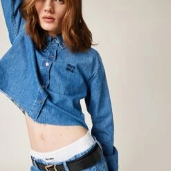 The timeless style of denim meets Miu Miu’s contemporary personality in this chambray shirt. Besides the classic collar, the garment has a bold, modern boxy cut and raw-cut hem that suggests an exposed construction process underlining the spontaneity of these actions. The embroidered logo stands out on the garment with its color contrast and iconic touch.
