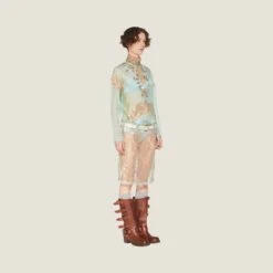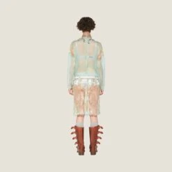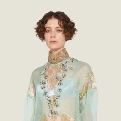 A study of a women’s wardrobe blends luxury and rebellion. Miu Miu reimagines classic garments, blending innovative tailoring and skilled know-how. Precious embroidery illuminates the collar of this lace dress with a fluid silhouette decorated with organza inserts.