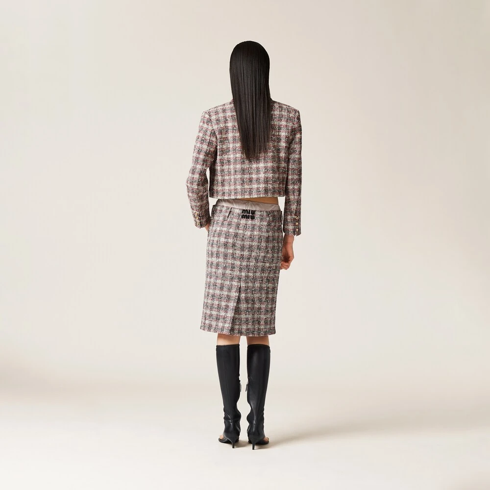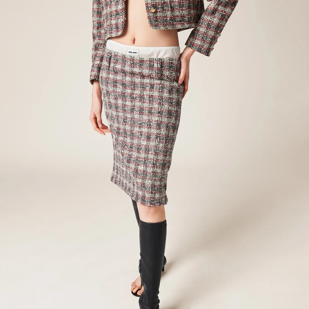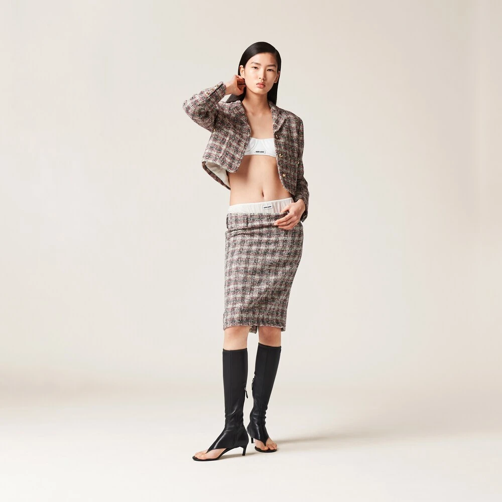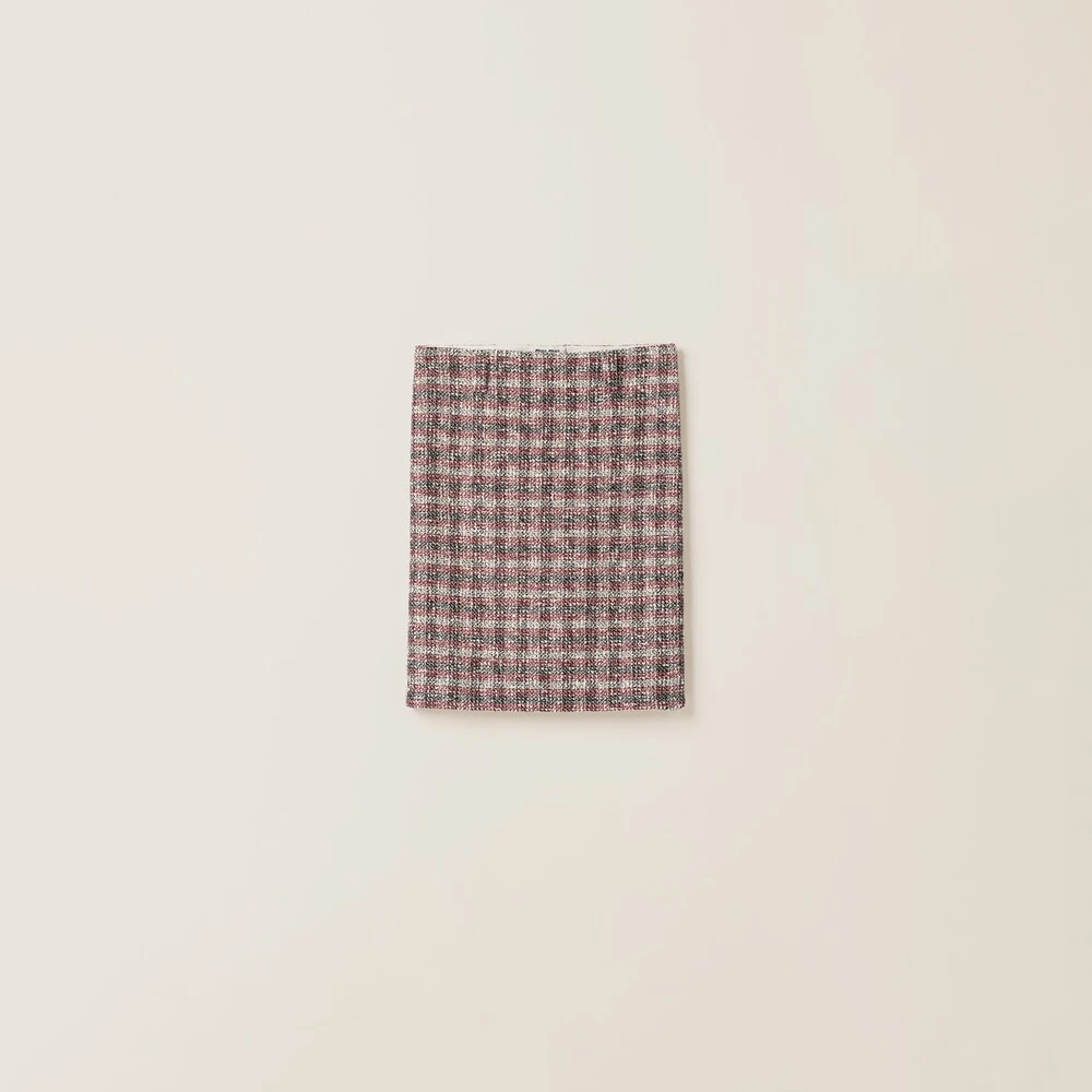 The classic check pattern embraces Miu Miu’s irreverent Miu Miu personality in this skirt. The embossed logo decorates this style with an iconic note.