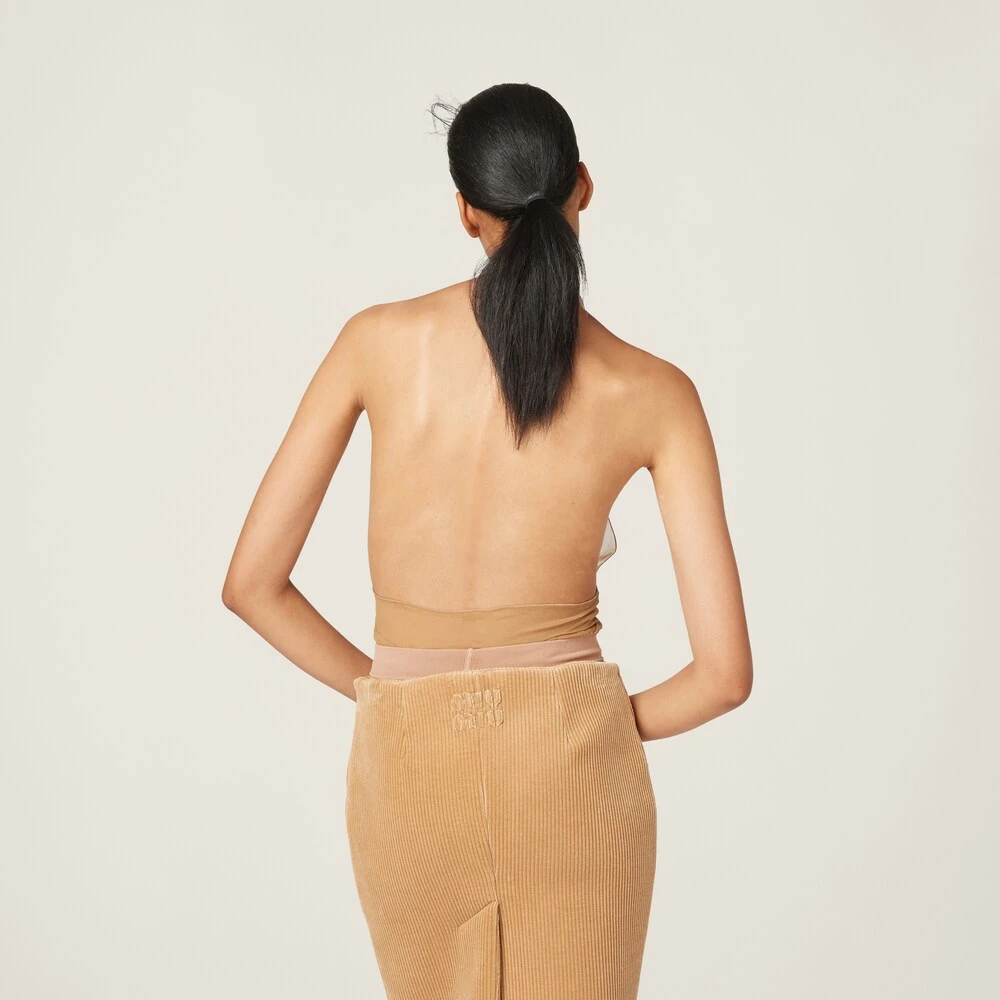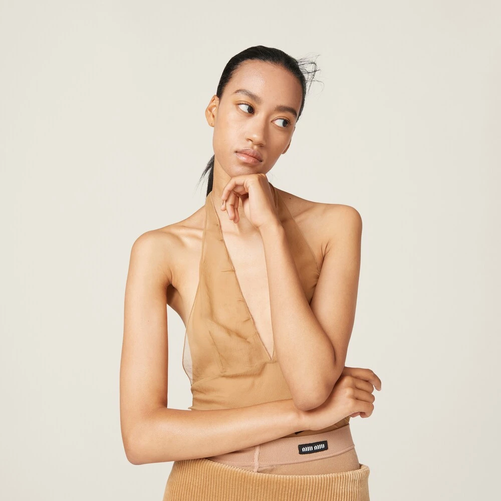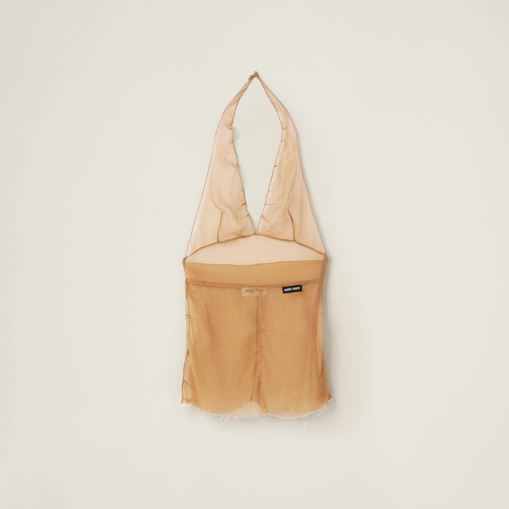 A sensual attitude, captivating look, and refined aesthetic characterize this chiffon top. The transparency of the sheer fabric makes this garment sexy yet refined, while the logo label completes the look with an iconic note.