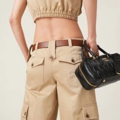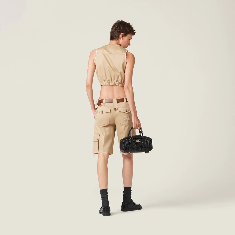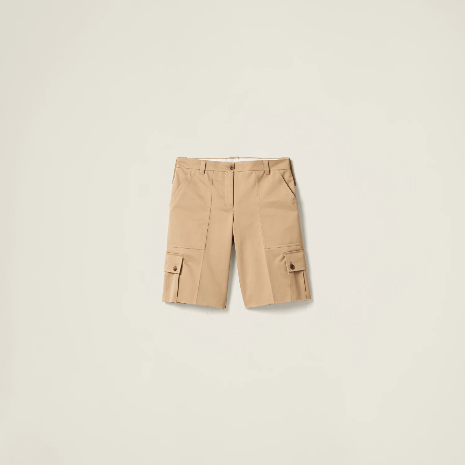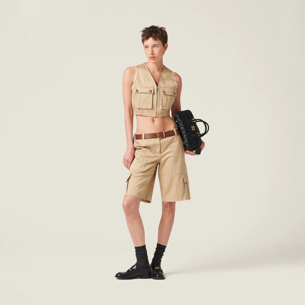 In these new chino Bermudas, Miu Miu brings back utility wear details and adapts them for a dynamic and extremely contemporary feminine look. The cargo pockets and buttoned flap pockets become pragmatic and functional elements while taking on an aesthetic meaning. The embroidered tonal logo completes the Bermudas with an iconic touch.
