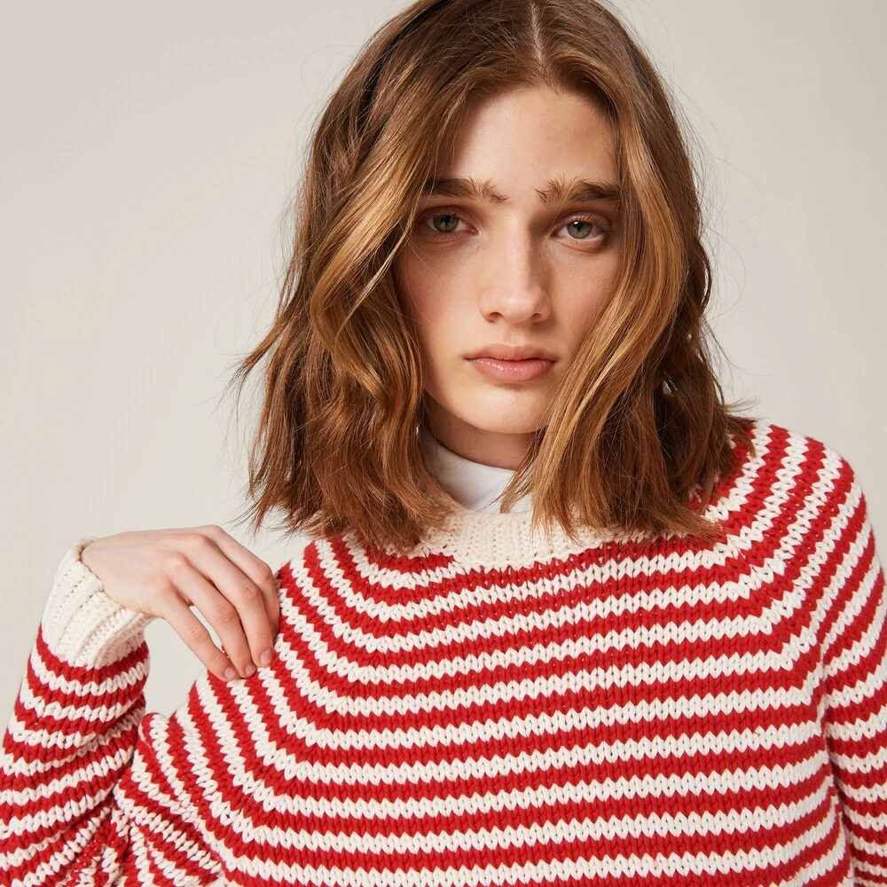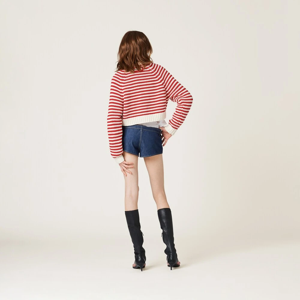 Fine artisan workmanship and hand crafting meet Miu Miu’s lively style in this cotton and cashmere sweater. Colorful horizontal stripes, interrupted by the crew-neck and ribbed knit cuffs and hem, define the sophisticated design. The knit logo patch completes the style with an iconic note.
