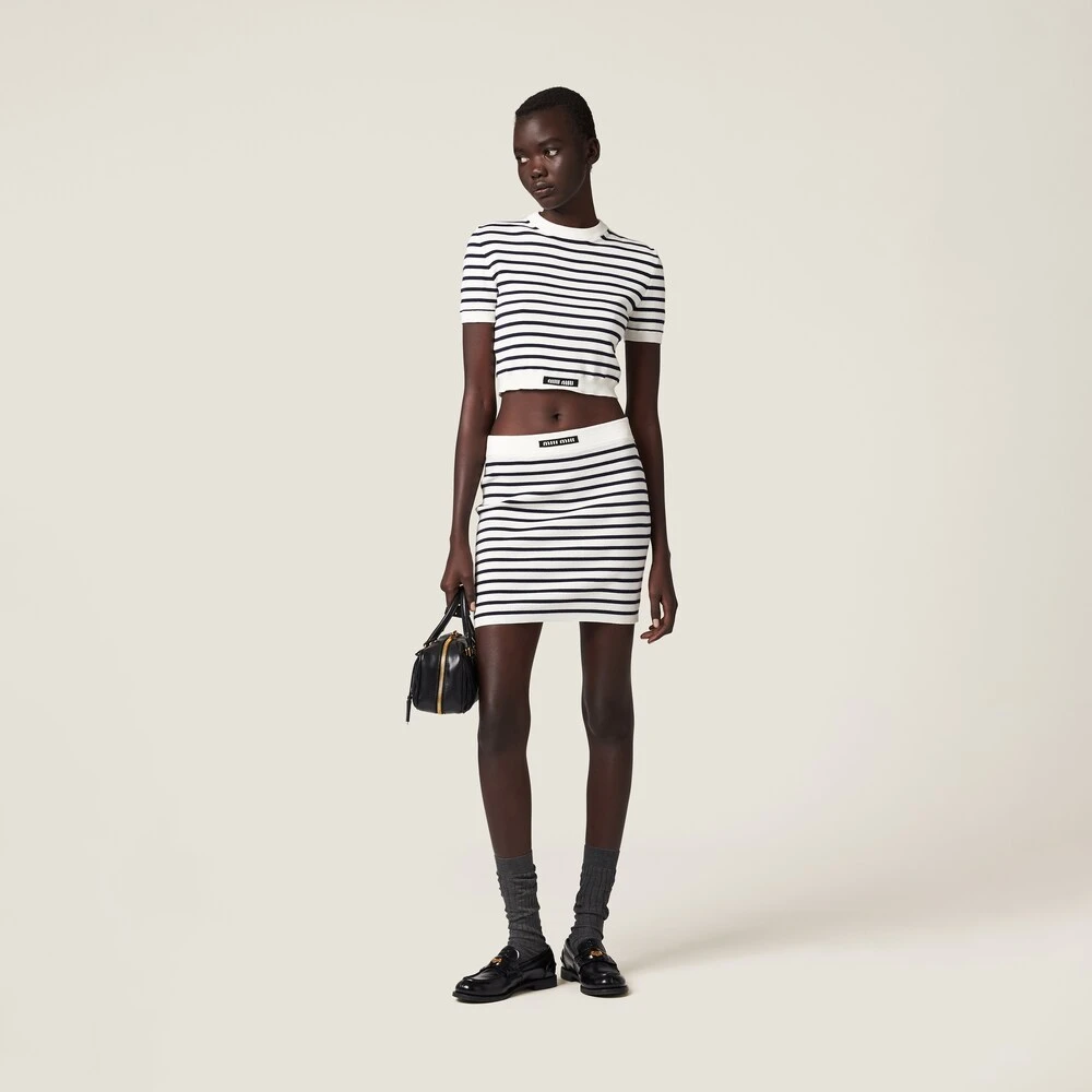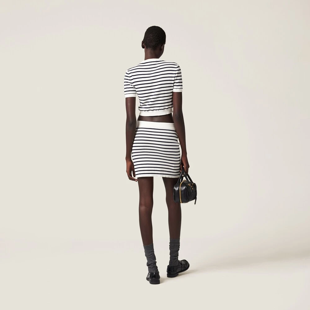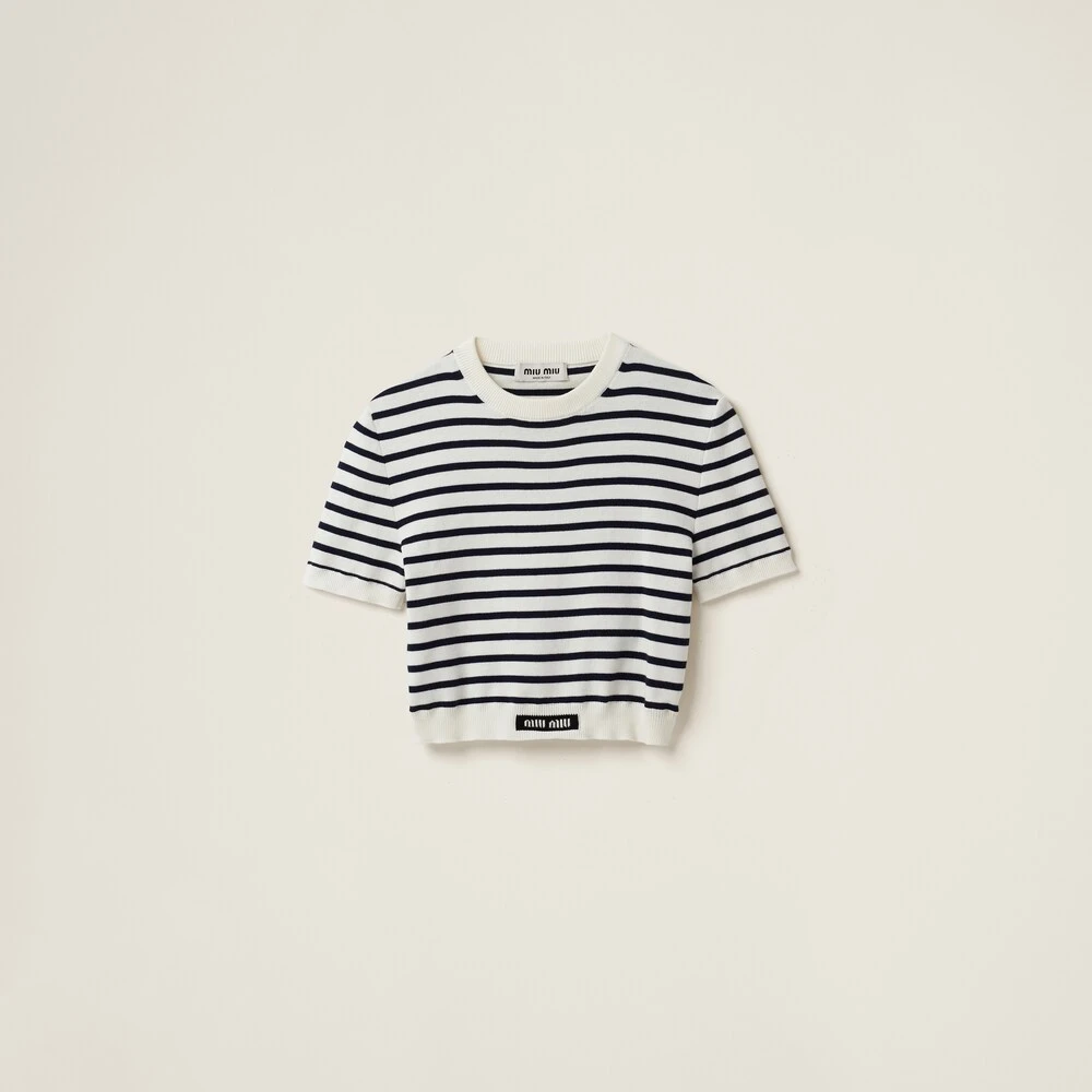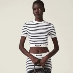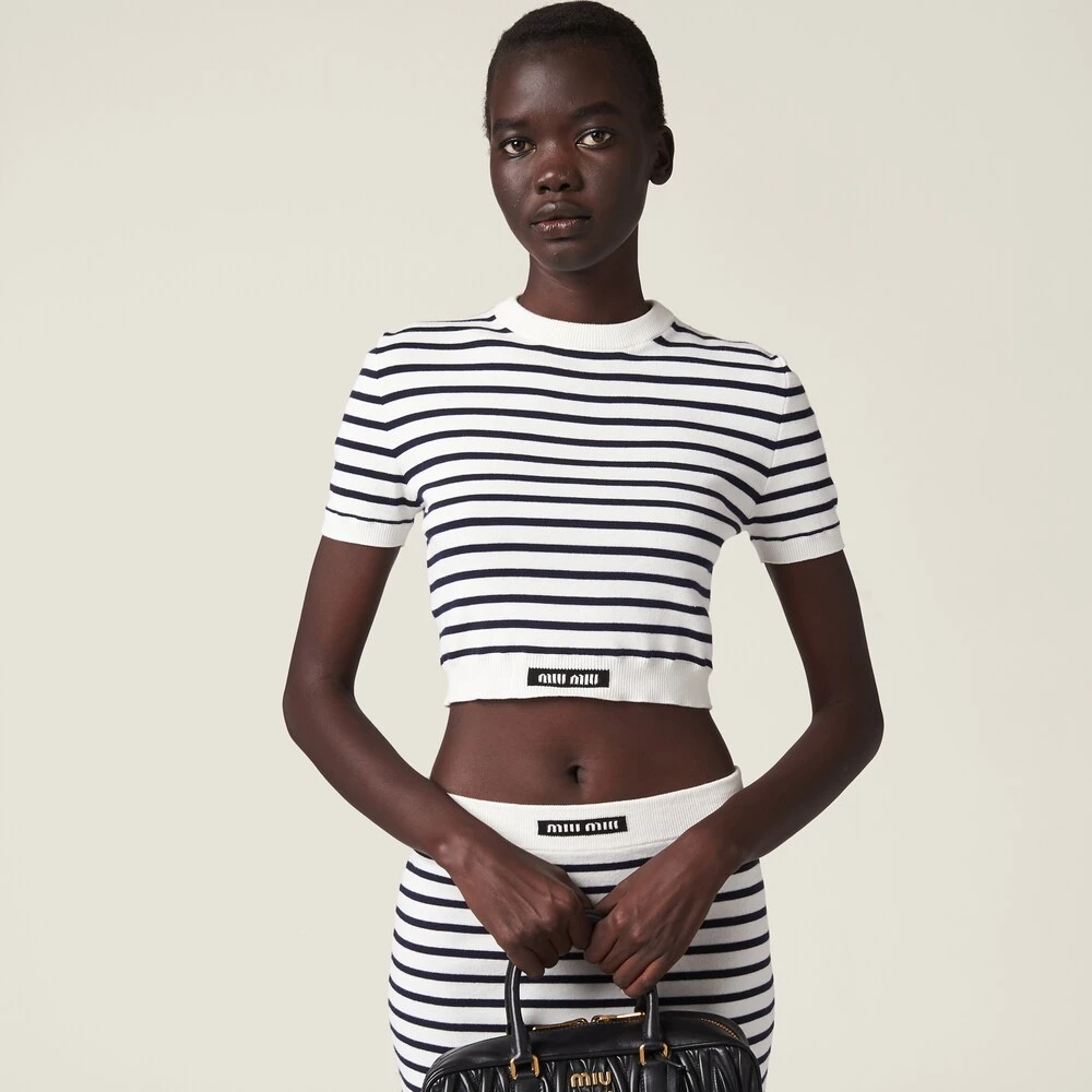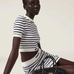 The world of stripes meets Miu Miu’s provocative character in this new cotton crew-neck sweater. The cropped lines are accompanied by ribbed knit trim and give the garment a contemporary look. The intarsia logo in a contrasting color on the hem completes the design with an iconic note.