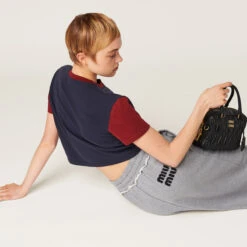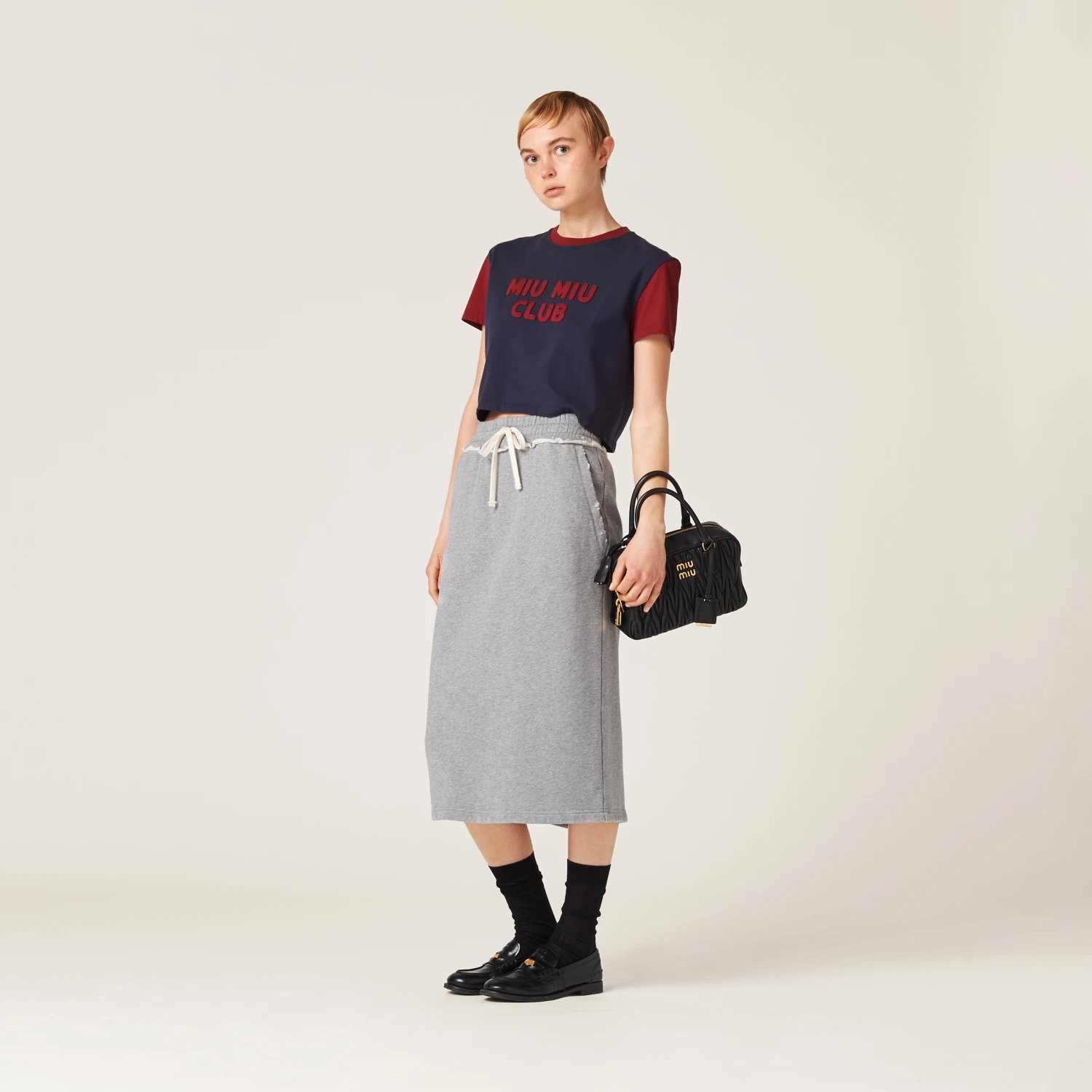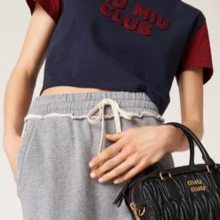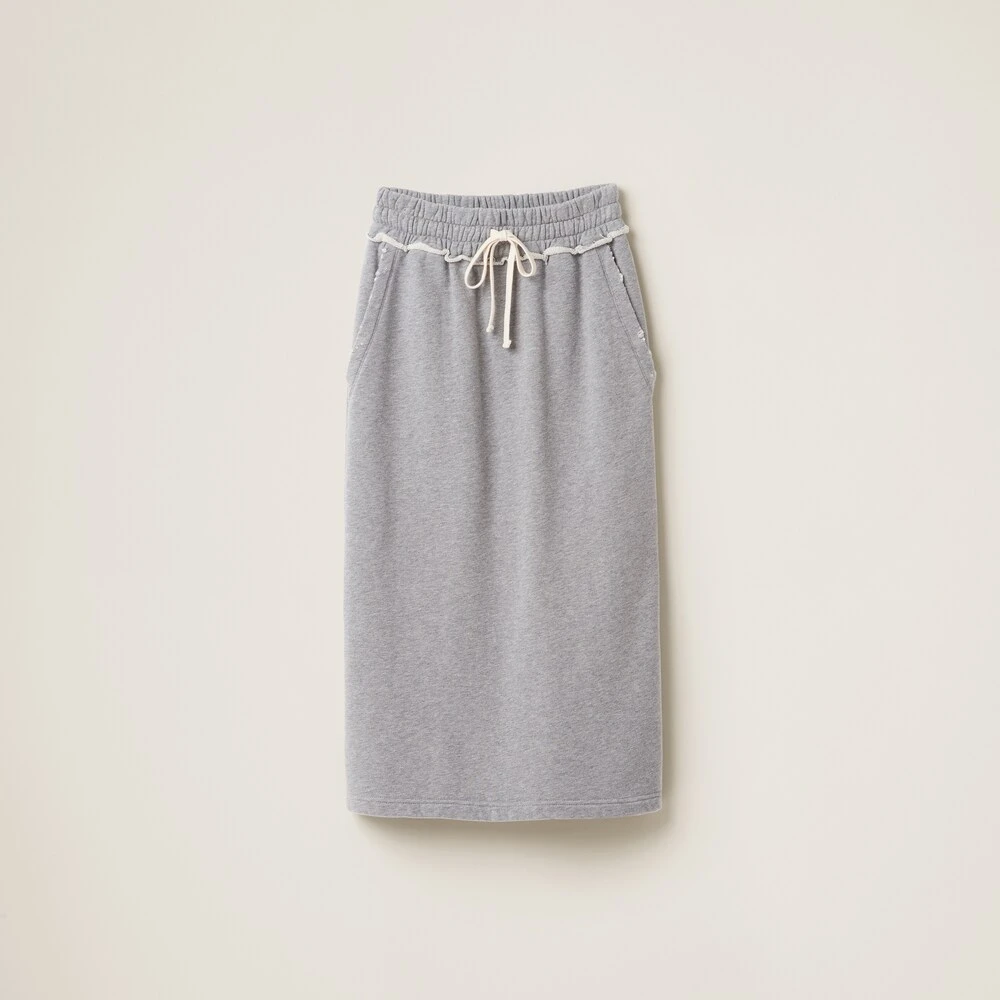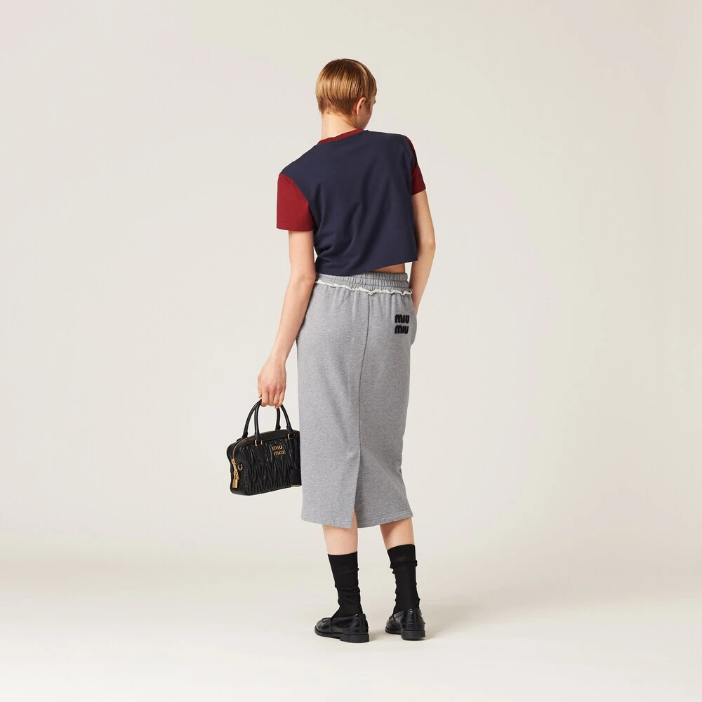 Sportswear meets the rebellious Miu Miu soul in the new cotton fleece skirt. The straight, sleek lines are accented by the elasticized drawstring waist and the embroidered logo that completes the aesthetic of the garment with an unexpected distinctive touch.