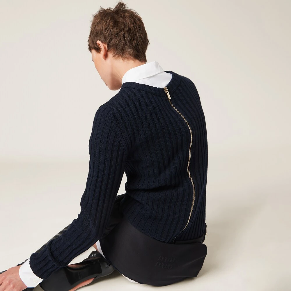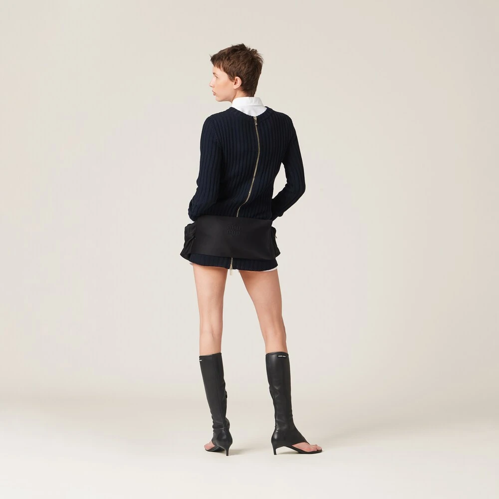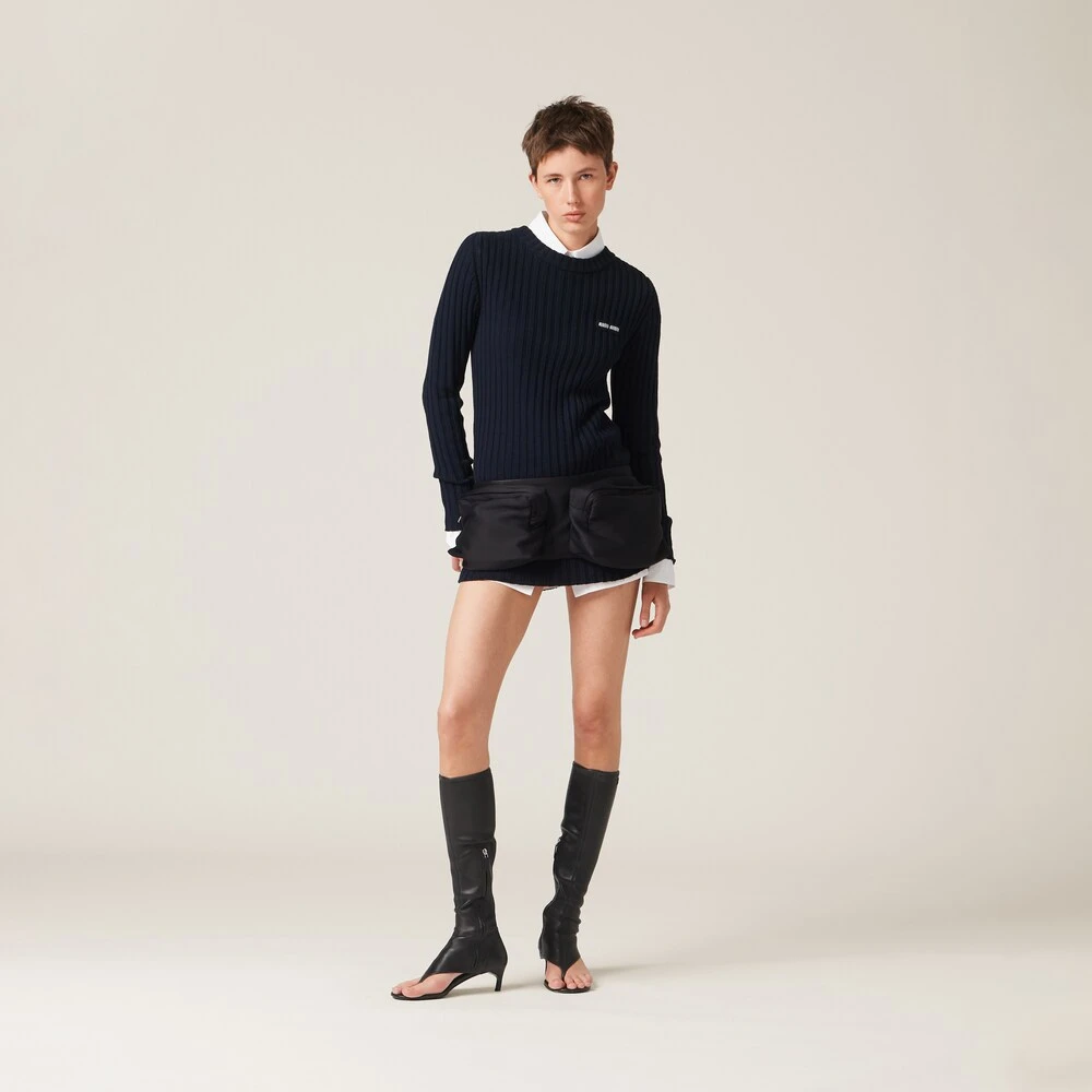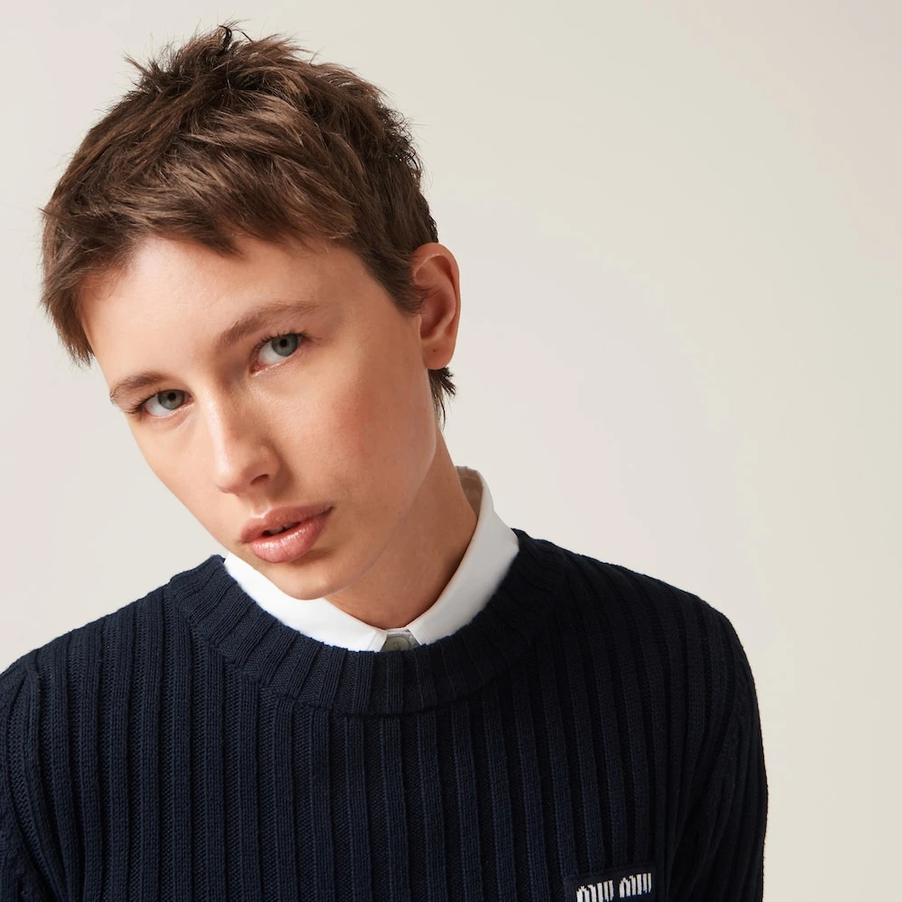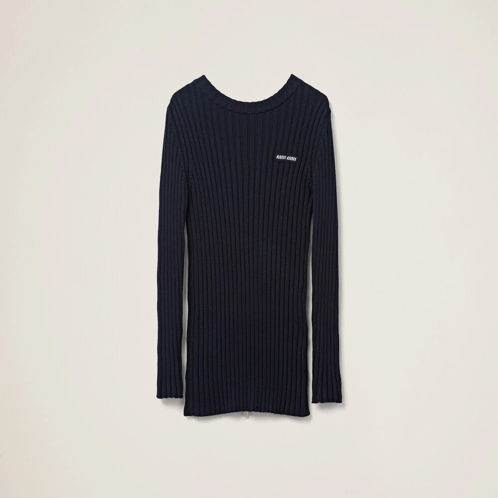 Present on the catwalk during the Spring-Summer 2023 show, this cotton knit mini-dress expresses a notion of fashion as a means of translating a reaction to current reality into material form. The slim fit and sleek lines are perfect for layering while the logo patch introduces a refined contrast and completes the design with an iconic and distinctive touch.