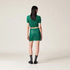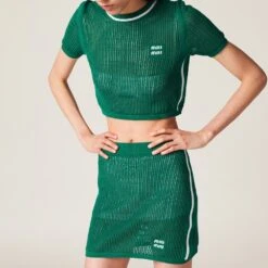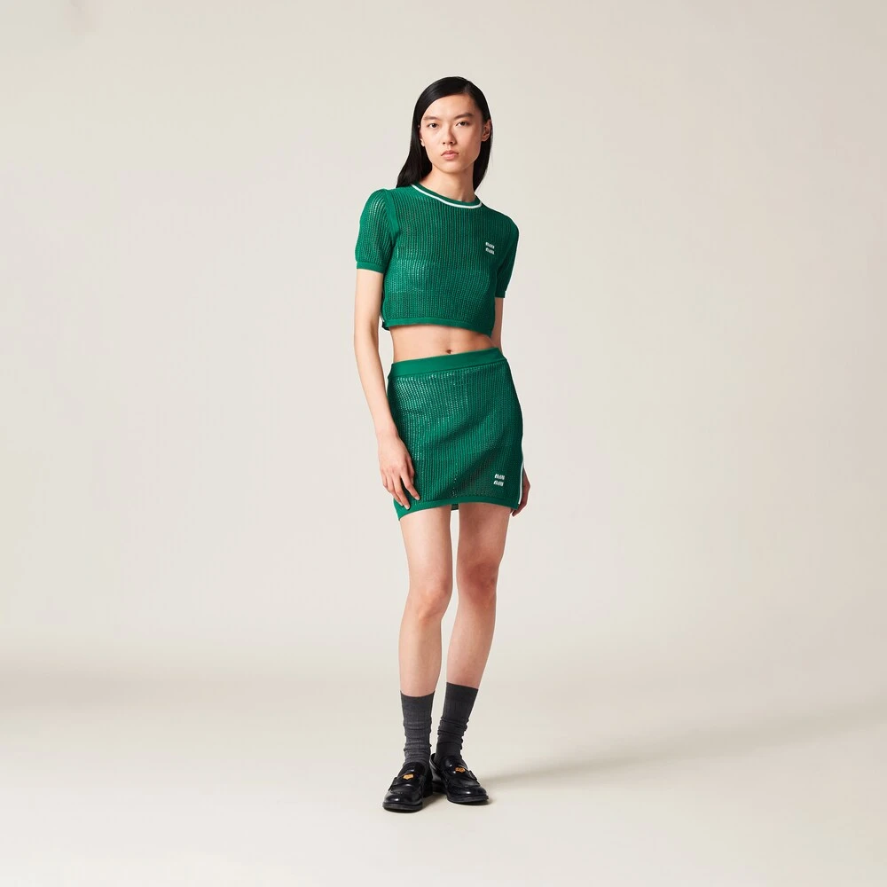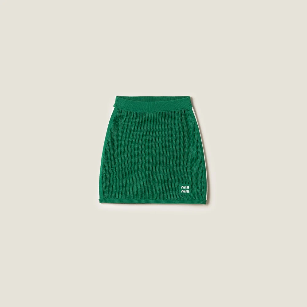 A special perforated knit motif that recalls mesh creates a refined transparencies in this cotton skirt. The ribbed knit hem introduces a sophisticated contrast while the intarsia logo completes the design with an iconic note.