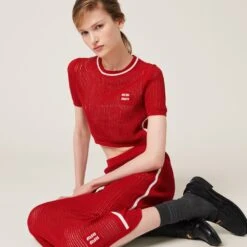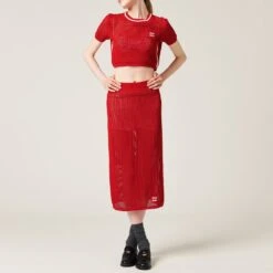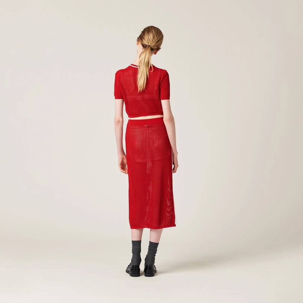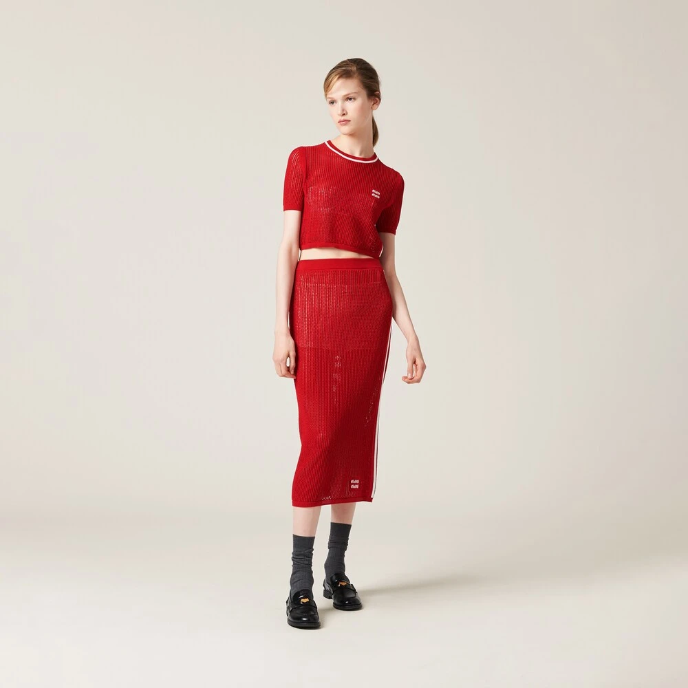 A special perforated knit motif that recalls mesh creates a refined transparencies in this cotton skirt, reinterpreting the classic pencil skirt. The ribbed knit waistband and hem introduce a refined contrast while the intarsia logo completes the design with an iconic note.
