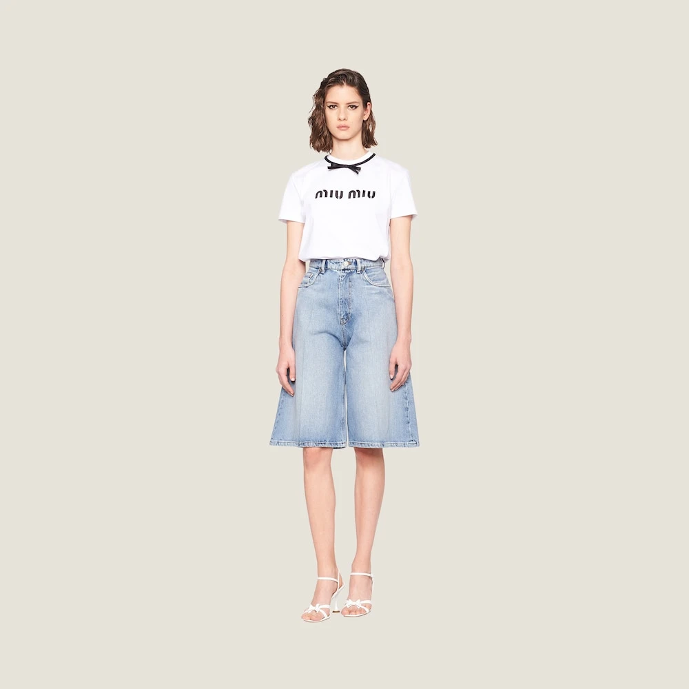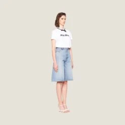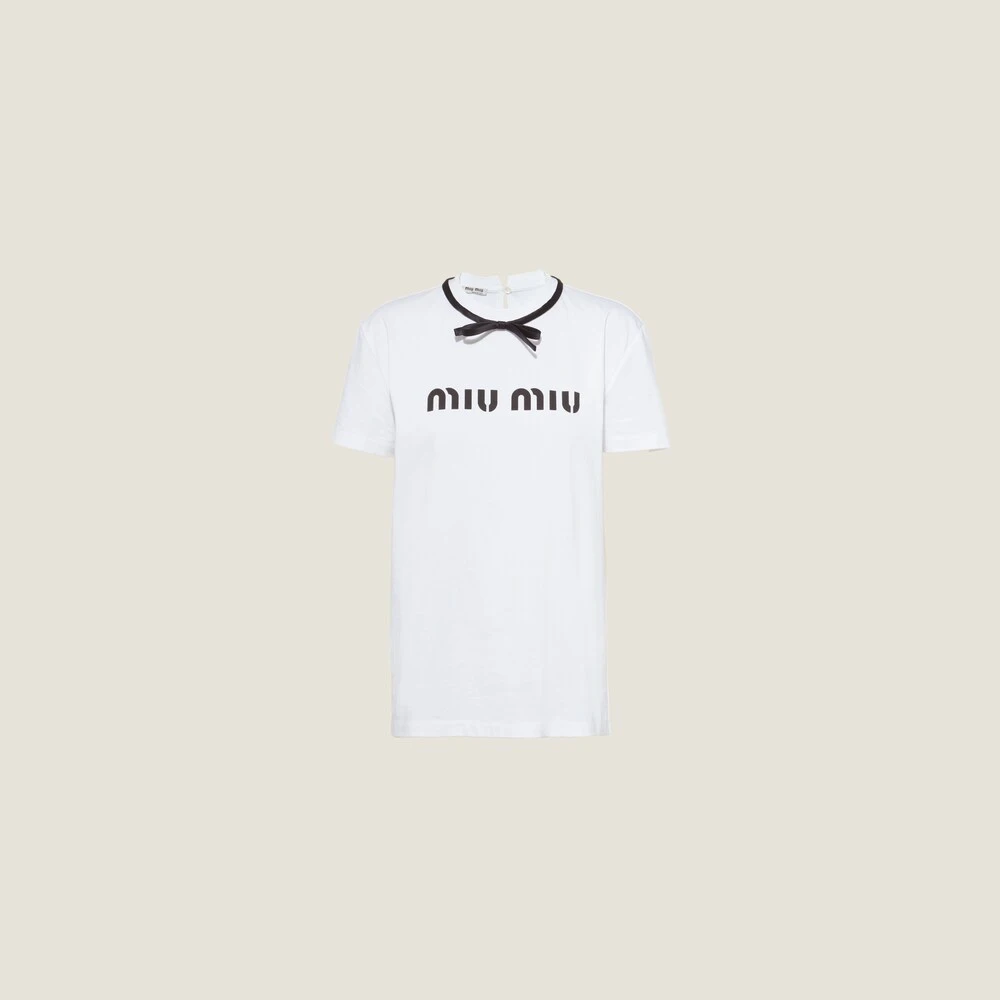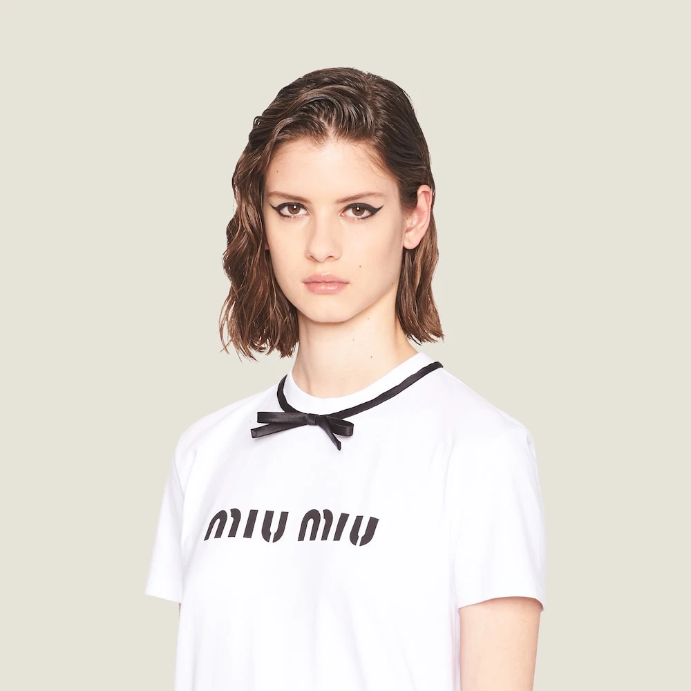 This T-shirt with sleek allure is decorated with refined details that give the garment minimalist elegance. A ribbon in a contrasting color circles the neck and forms a bow on the front. The printed lettering logo adds a modern touch to the tee.