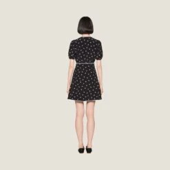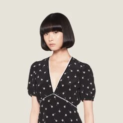 Fresh, vivacious style meets distinct femininity in this new crepe de chine mini-dress. The floral print is accented with velvet and lace details that complete the delicately feminine taste of the garment. Flared lines and a plunging V-neck define its irreverent silhouette.