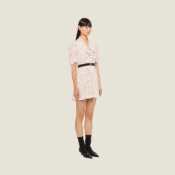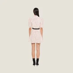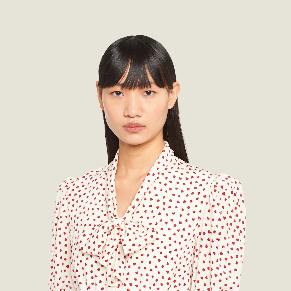 Romantic, playful allure characterizes this new crepe de chine mini-dress with a heart print. The print, which contrasts with the background, gives the dress a vivacious look, while the neckline with pussy bow and flared lines give the garment movement. The elasticized waistband with contrasting logo completes the garment with an iconic touch.