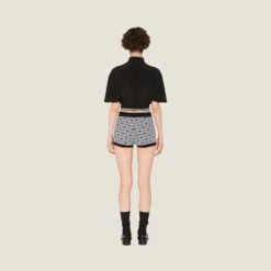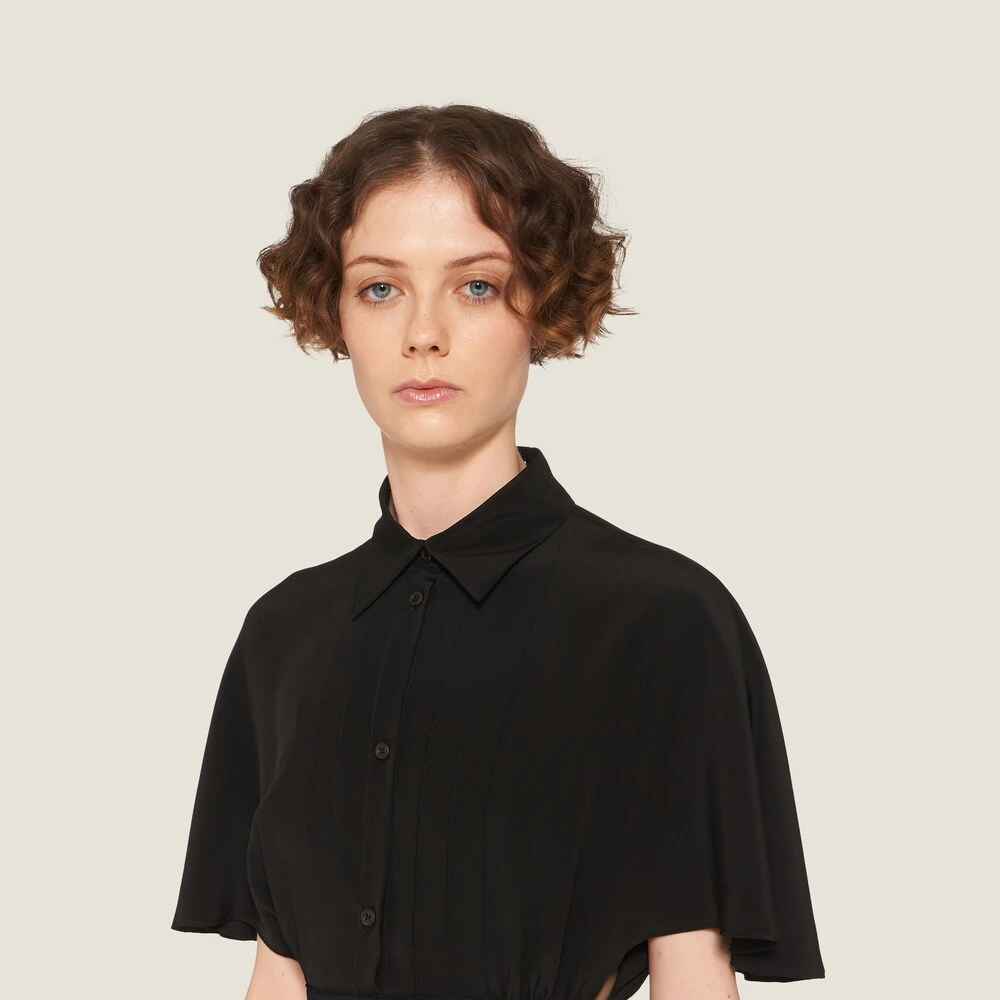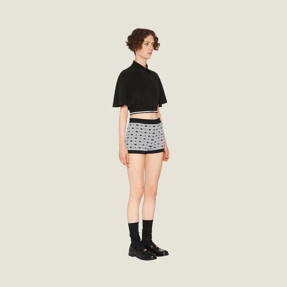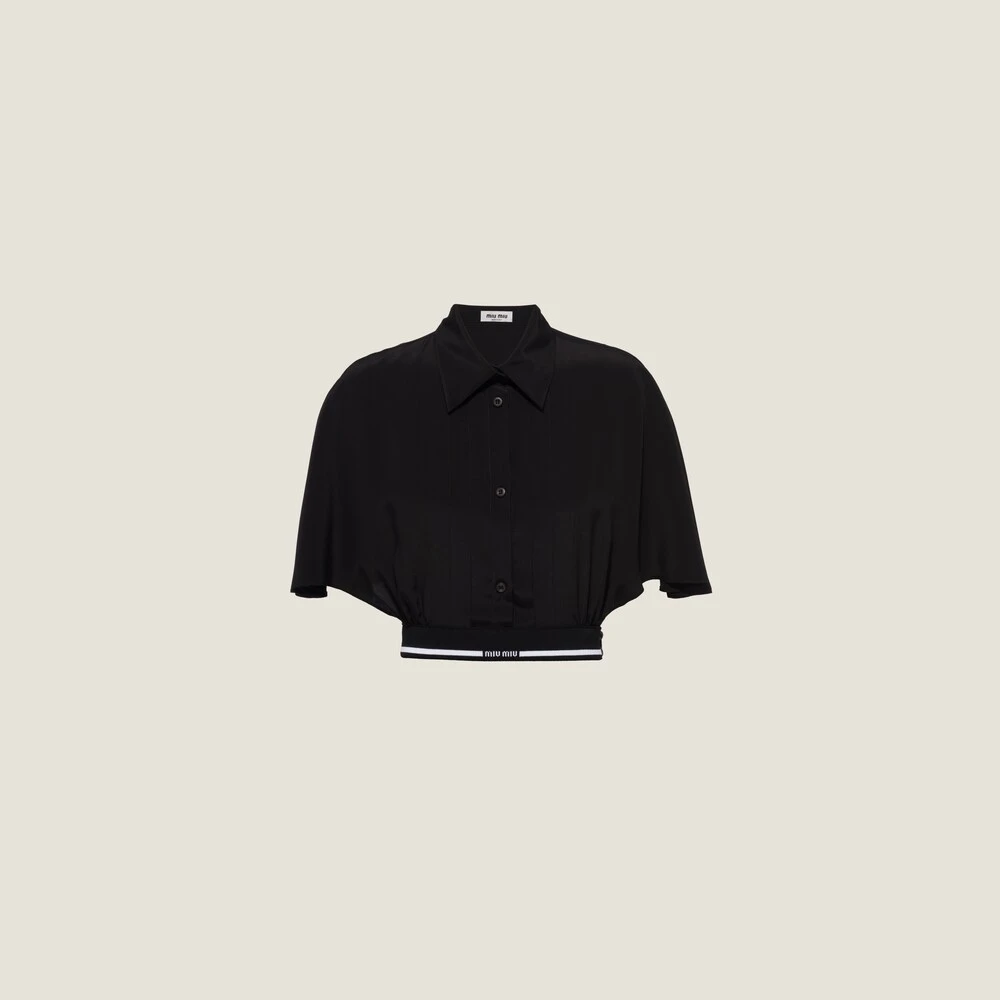 The world of shirting and knitwear details come together in this new crepe de chine top. The collar and button closure in classic shirtwear style are combined with a light pleating on the front and kimono sleeves that accentuate its oversized silhouette. Meanwhile, the knit waistband with contrasting logo completes the garment with a glamorous touch.