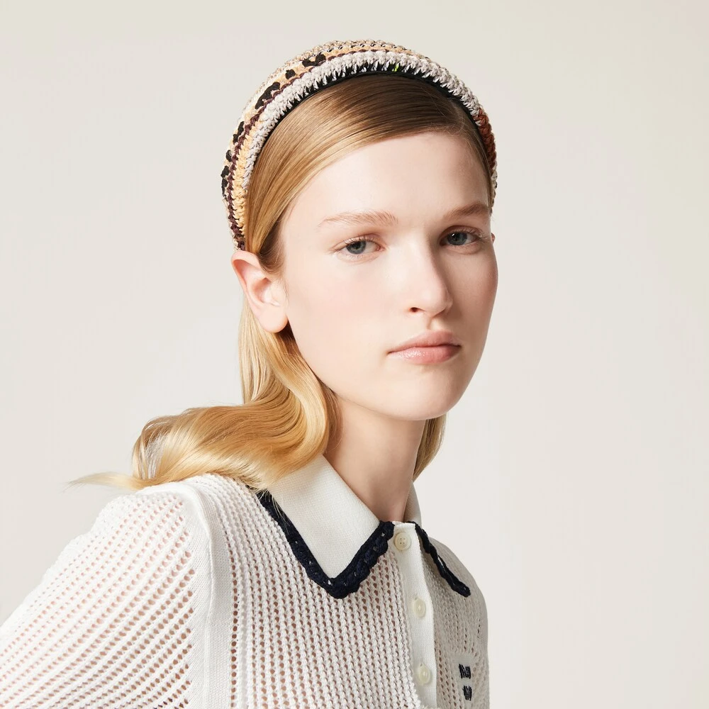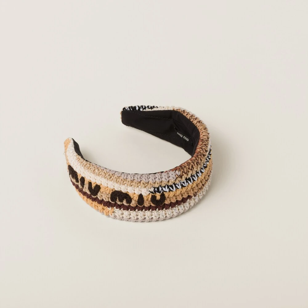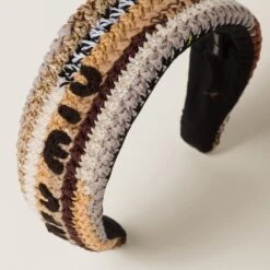 A vibrant color-block pattern animates this crochet headband. Retro references and sophisticated workmanship distinguish this accessory embellished with the iconic embroidered Miu Miu logo.