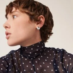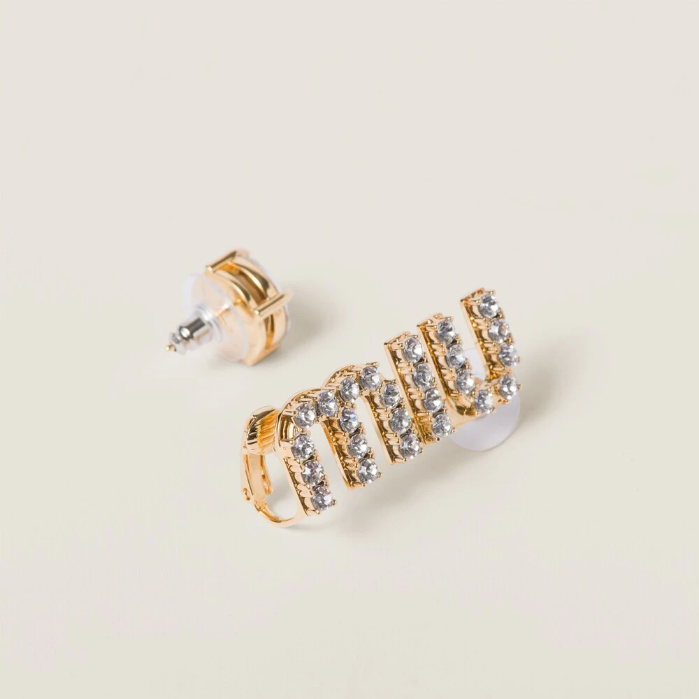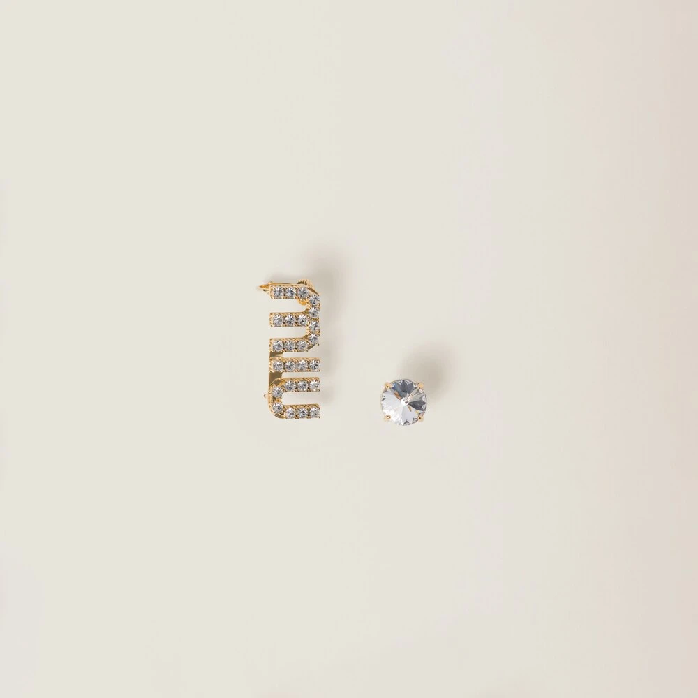 The iconic lettering logo is the protagonist of the precious new Miu Miu Jewelry collection and appears in new and different ways. Dazzling crystals illuminate these earrings with an asymmetric design.