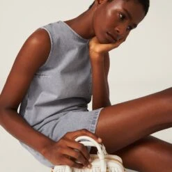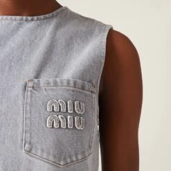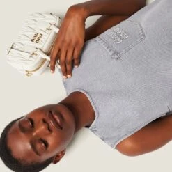 The timeless character of denim meets Miu Miu’s effortless femininity in this dress. The patch pocket on the chest is decorated with the embroidered logo that adds an unexpected, distinctive note to the look.