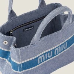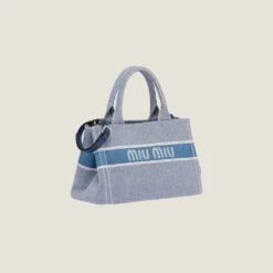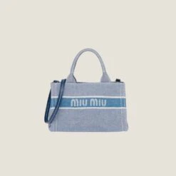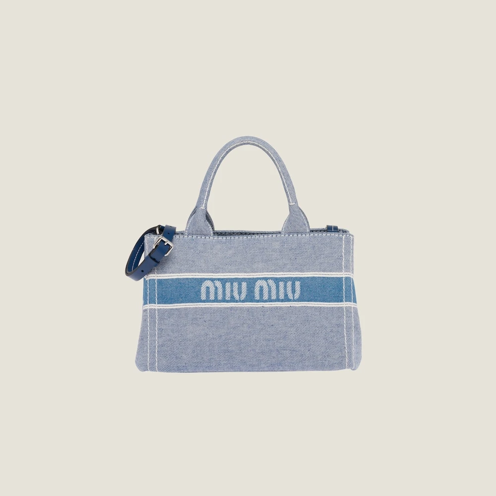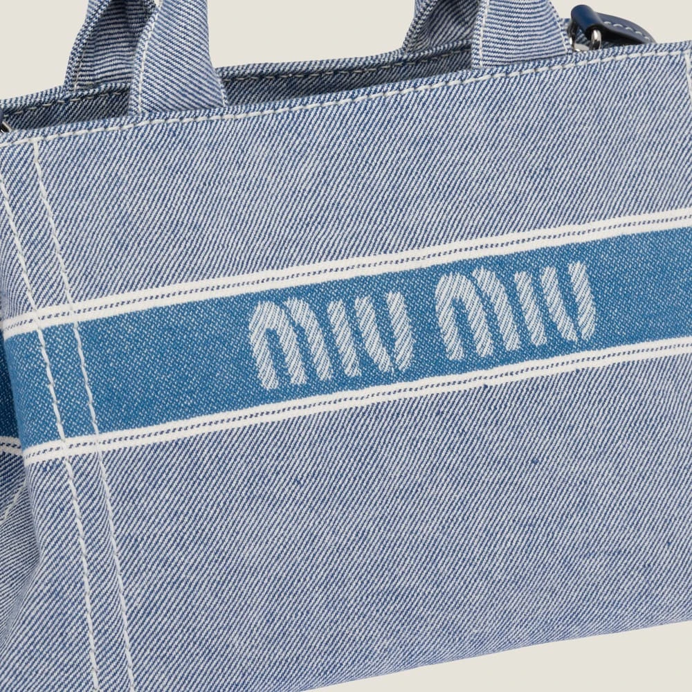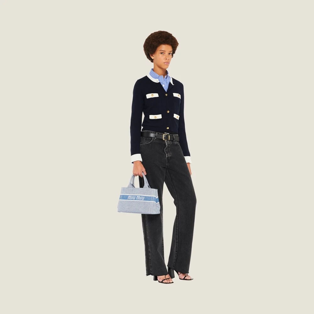 A sleek design with a streetwear mood defines this denim handbag. A wide contrasting stripe frames the refined jacquard lettering logo, giving the accessory a sporty touch.