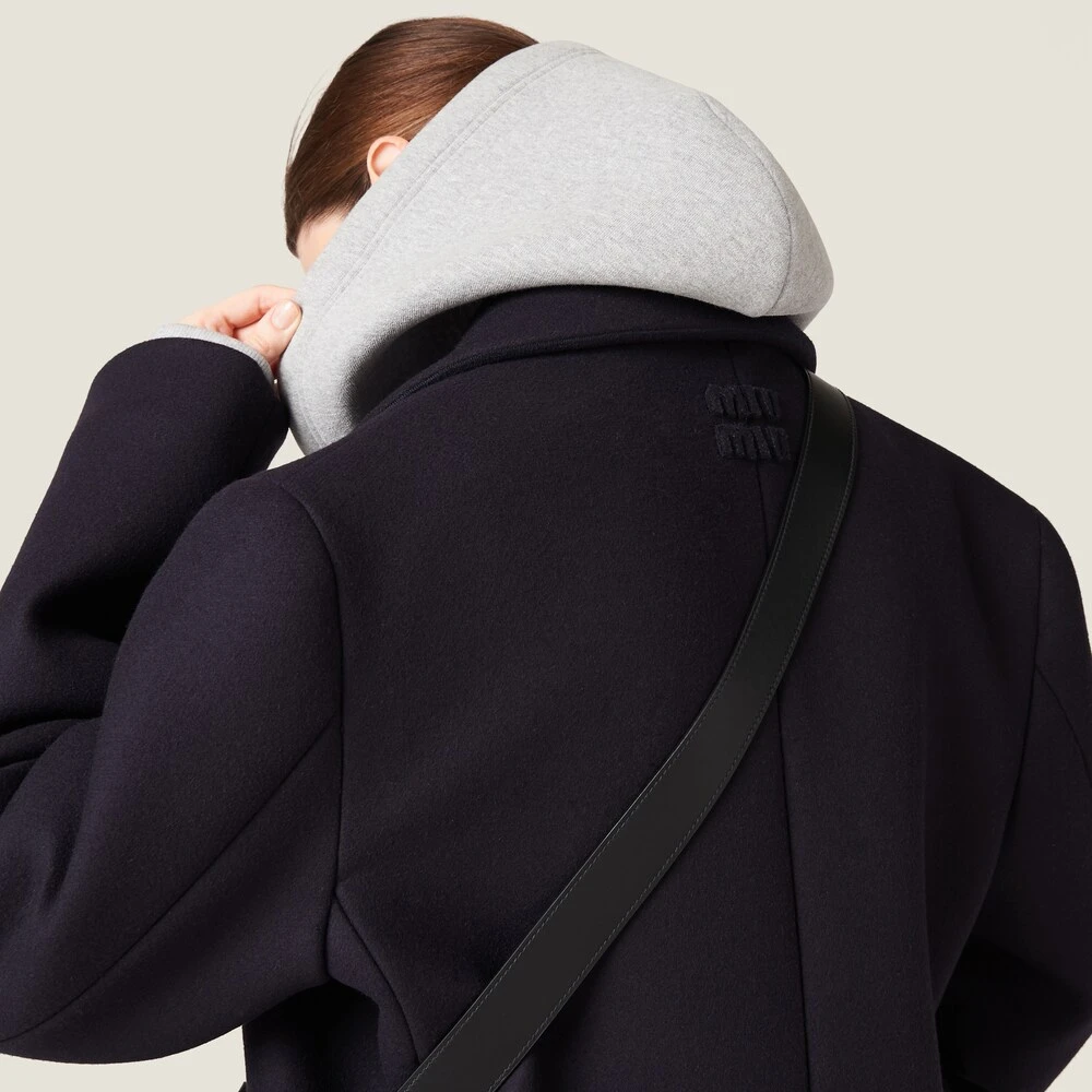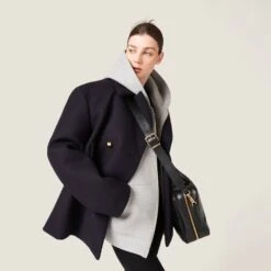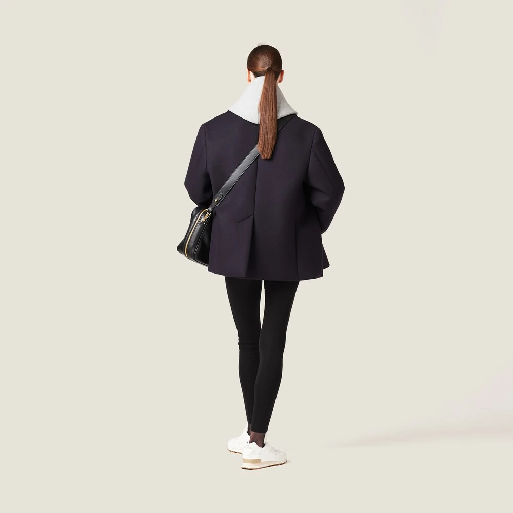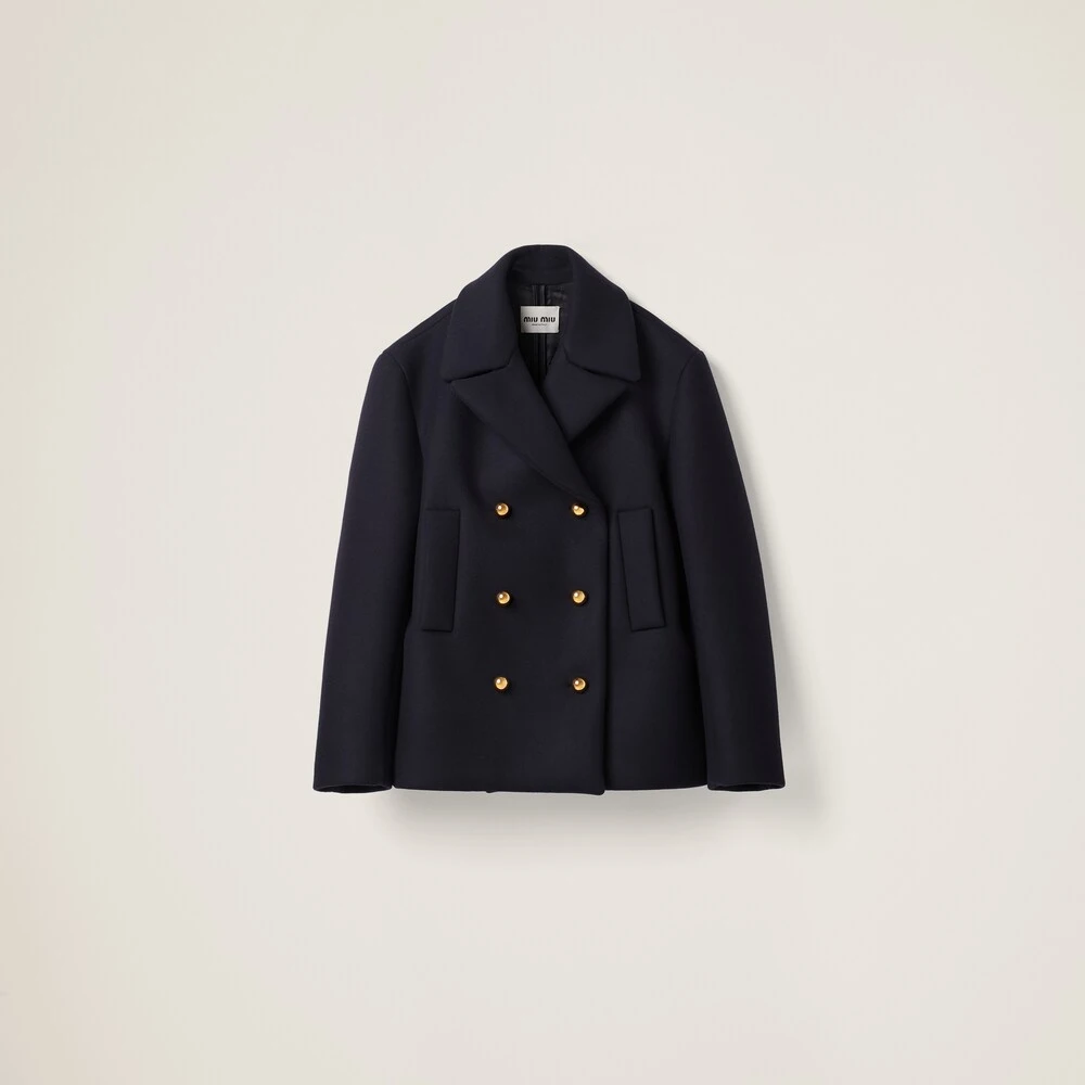 Menswear inspiration, oversized lines, and sartorial elegance characterize this double-breasted cloth peacoat jacket. Golden buttons stand out on the garment, adding lustrous touches, while the tonal embroidered logo completes the look with an unexpected distinctive note.