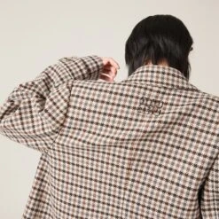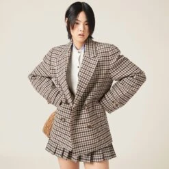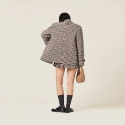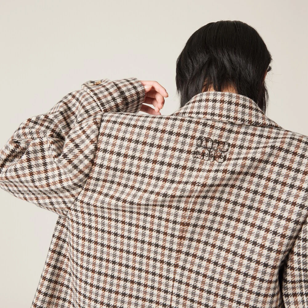 The classicism of houndstooth check is reinvented by Miu Miu’s innovative personality in this double-breasted jacket. The classic details of the important lapels and the double-breasted style coexist with the devoré embroidered logo that completes the look with an iconic note.