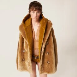 This jacket combines a double-breasted style with notch lapels borrowed from menswear and the warm, cozy look of shearling. The logo patch completes the look with an iconic note.