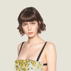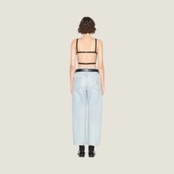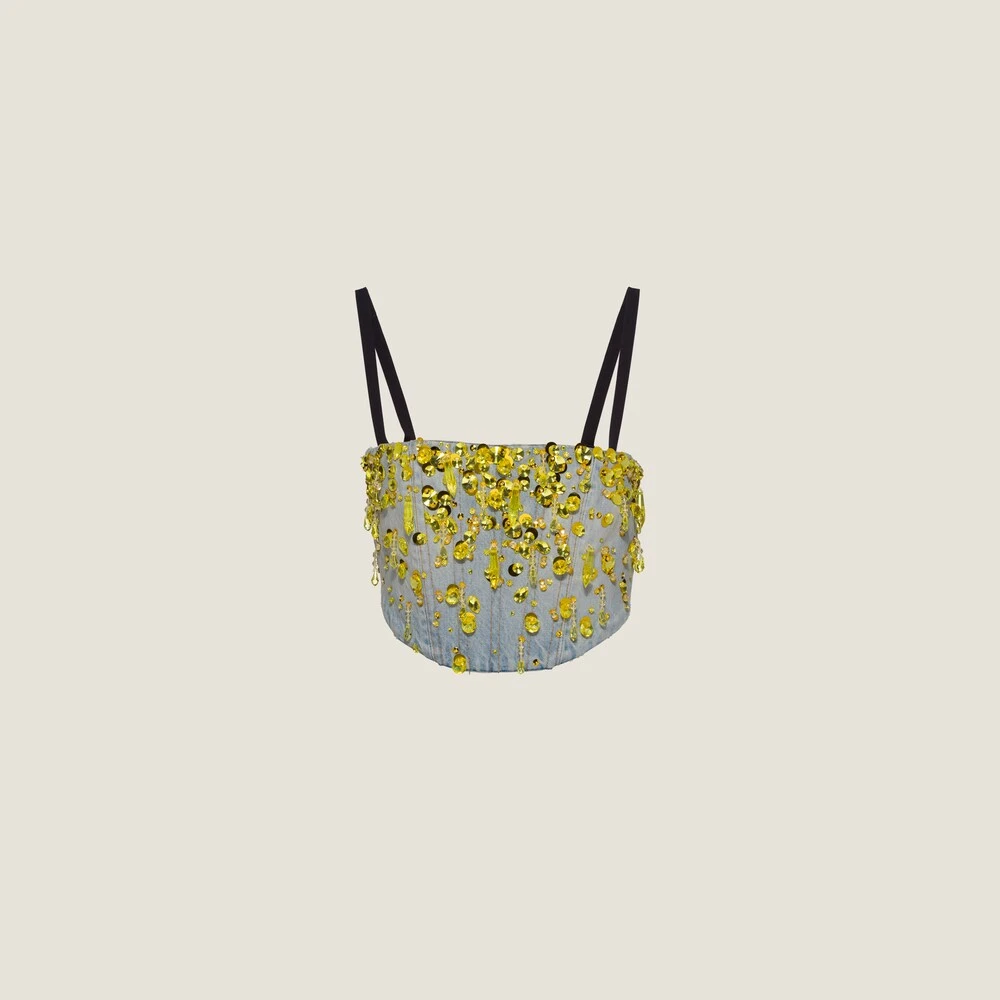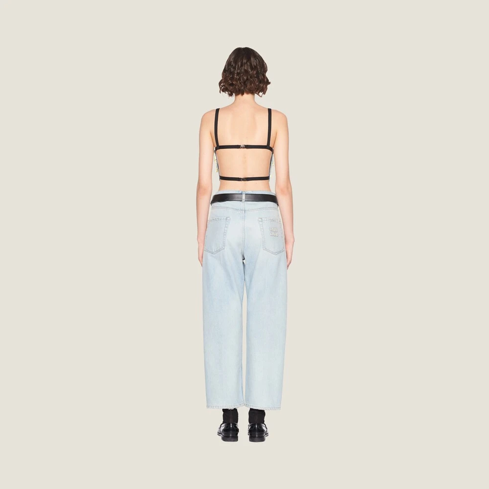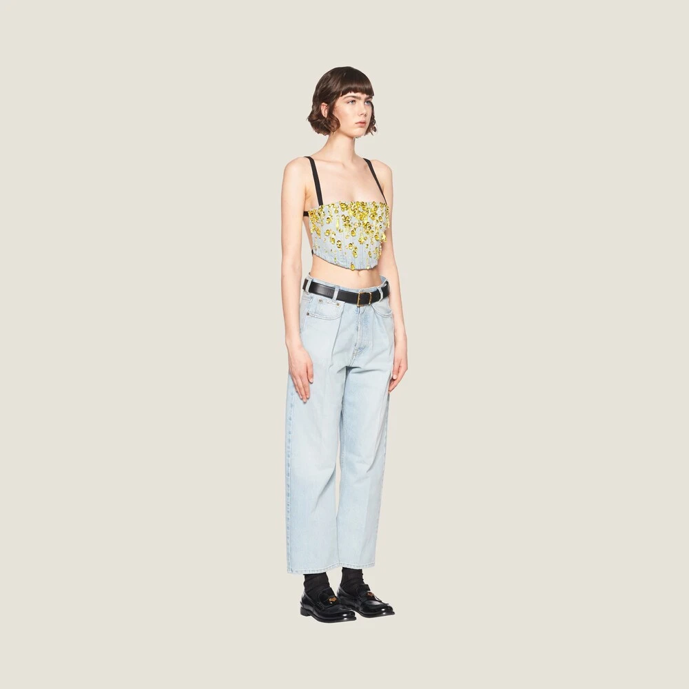 This denim top combines retro design and precious decorations. The elegance of the sparkling crystals enhances the fabric with a streetwear mood, expressing a modern yet elegant personality with an interplay of contrasting textures.