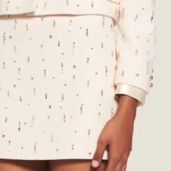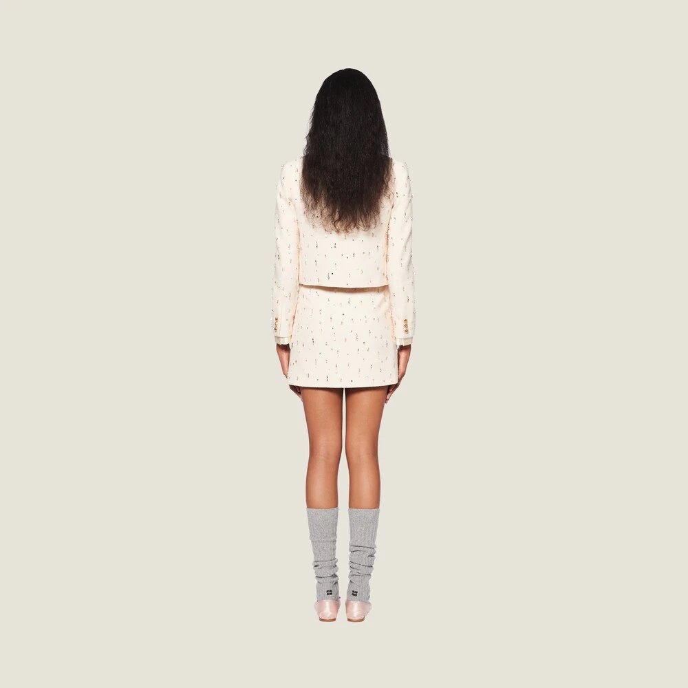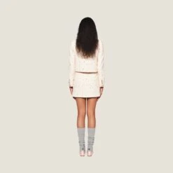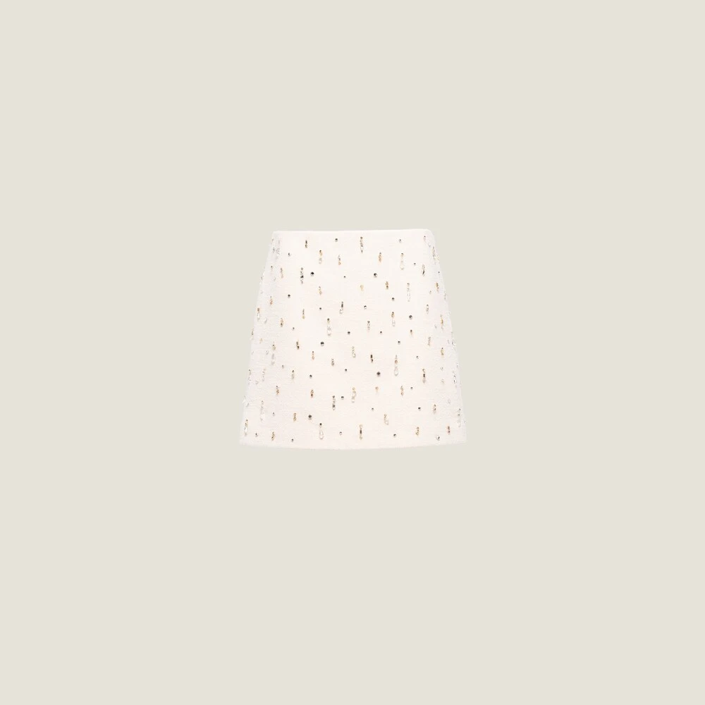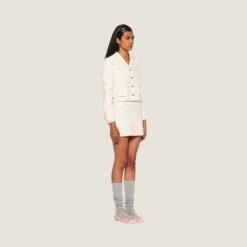 This finely embroidered miniskirt embodies a mix of modern sleekness and retro allure. Miu Miu plays with classic motifs and tailored lines to create new designs, an always new definition of femininity.