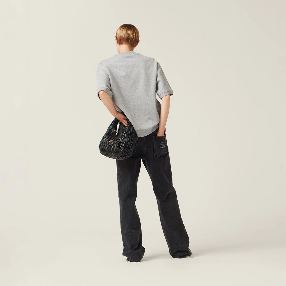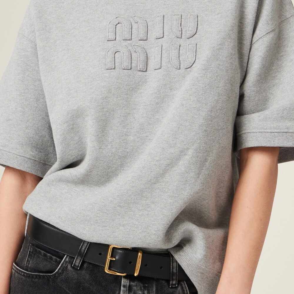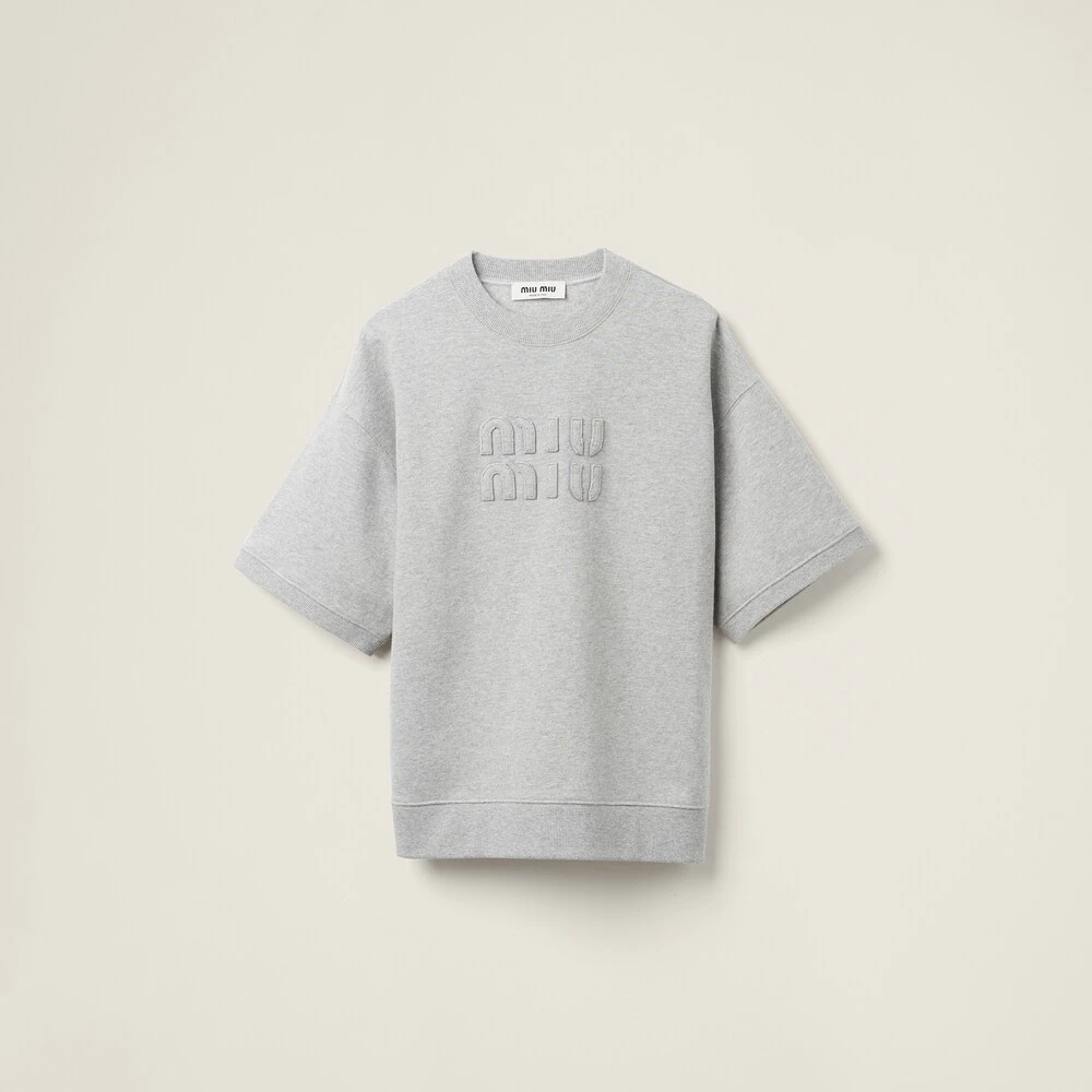 Femininity and oversized lines create a new aesthetic language where the fabric, with a vintage style, meets delicately-embroidered details. Between ornamental and structure, this cotton style comes with short sleeves and a ribbed band.