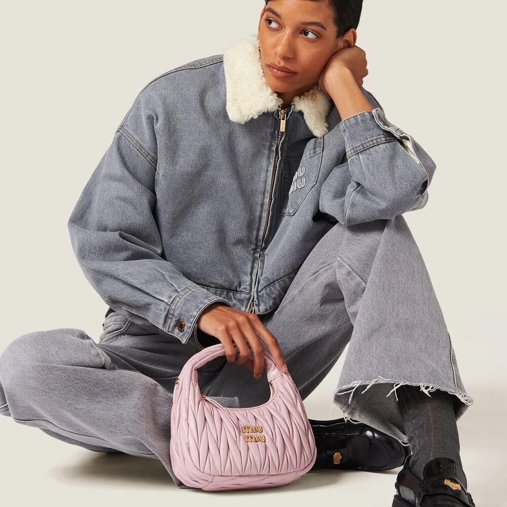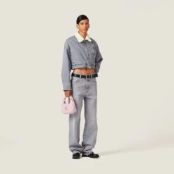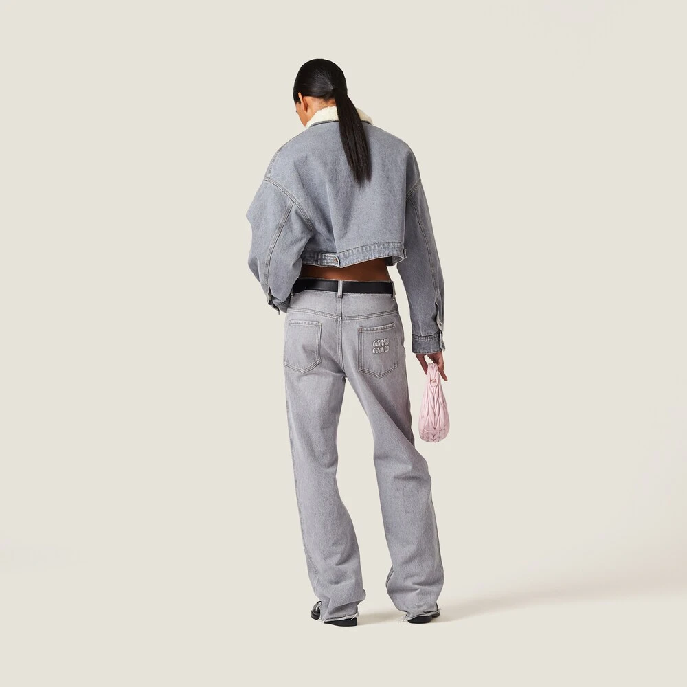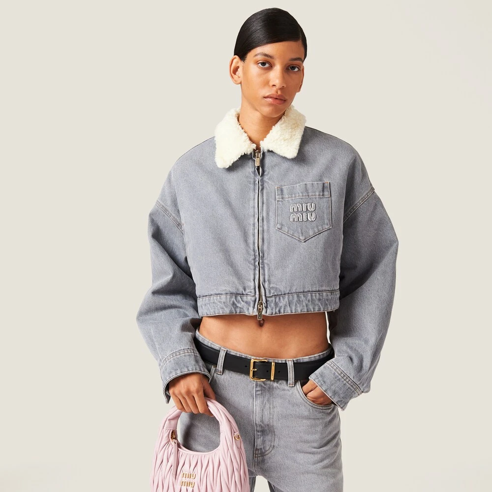 The timeless style of denim meets Miu Miu’s casual attitude in this blouson jacket. The soft textured collar introduces a refined contrast while the embroidered logo on the patch pocket adds an iconic note to the garment. The oversized lines define the relaxed look.
