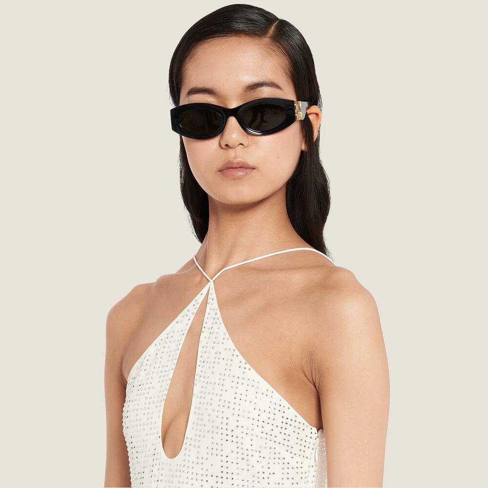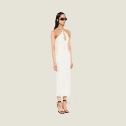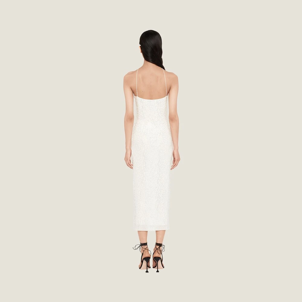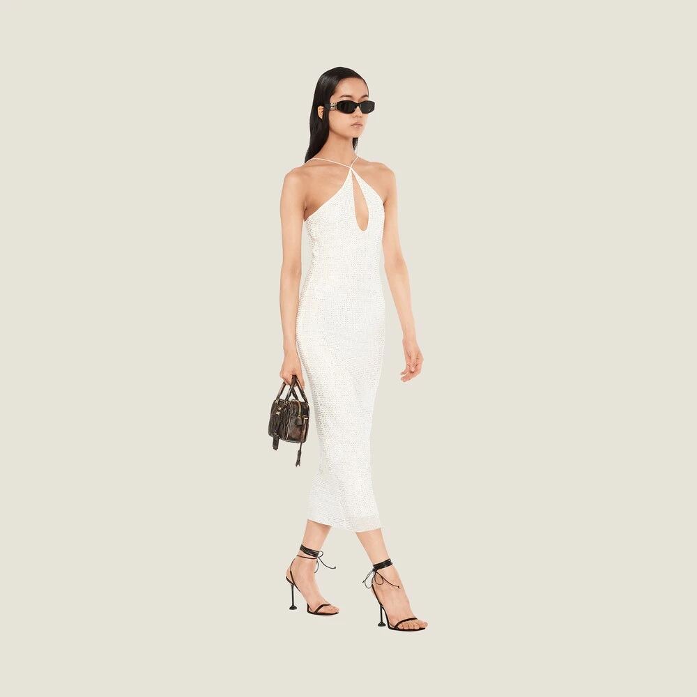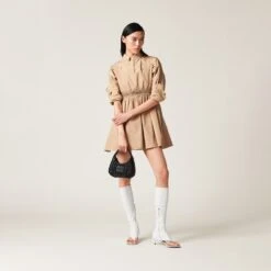 A romantic silhouette defines a finely embroidered georgette dress. Miu Miu offers a modern new take on eveningwear with expert craftsmanship.