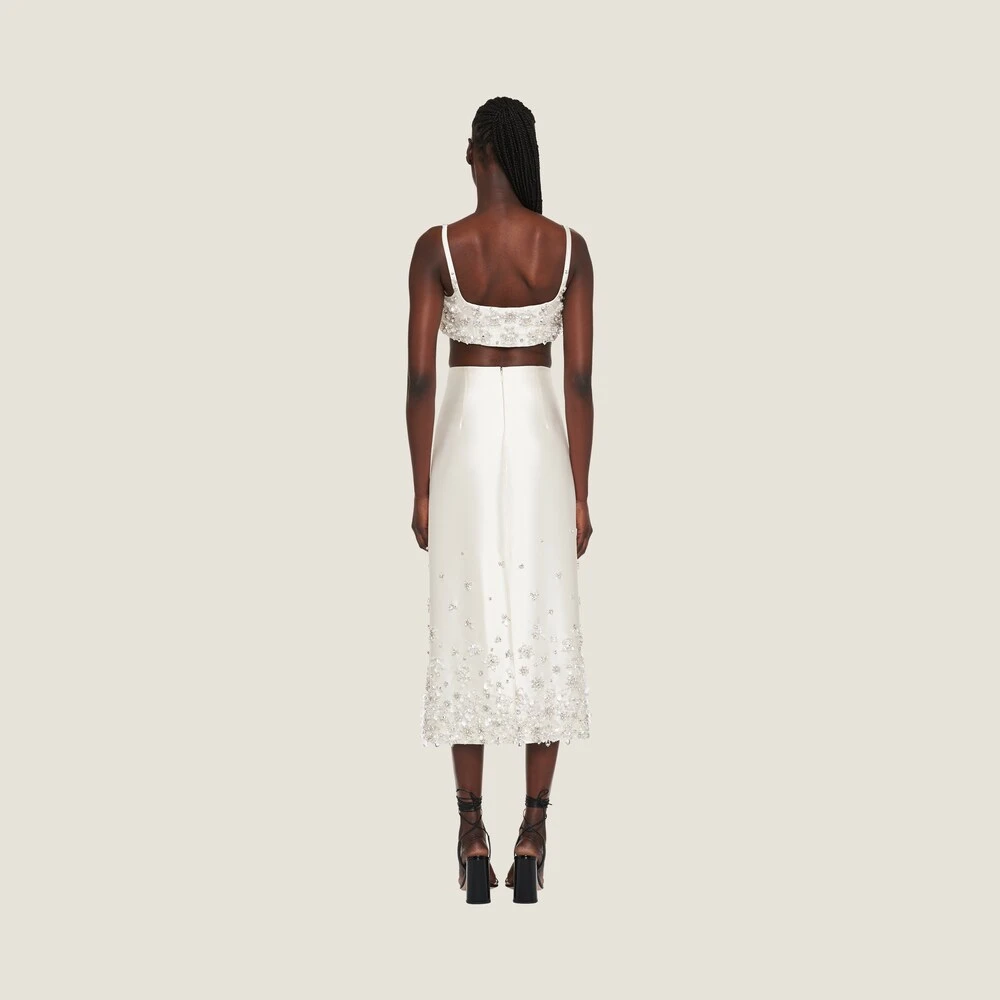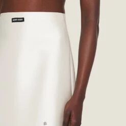 As an exercise in references and a study of reality, existing styles are used to create new irreverent silhouettes through novel proportions and precious details. Classic tailoring is subverted and women’s garments take on new meaning. Ironic, ultra-feminine design and embroidery that interprets eveningwear embellishments characterize this skirt decorated with the Miu Miu knit logo on the front.