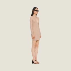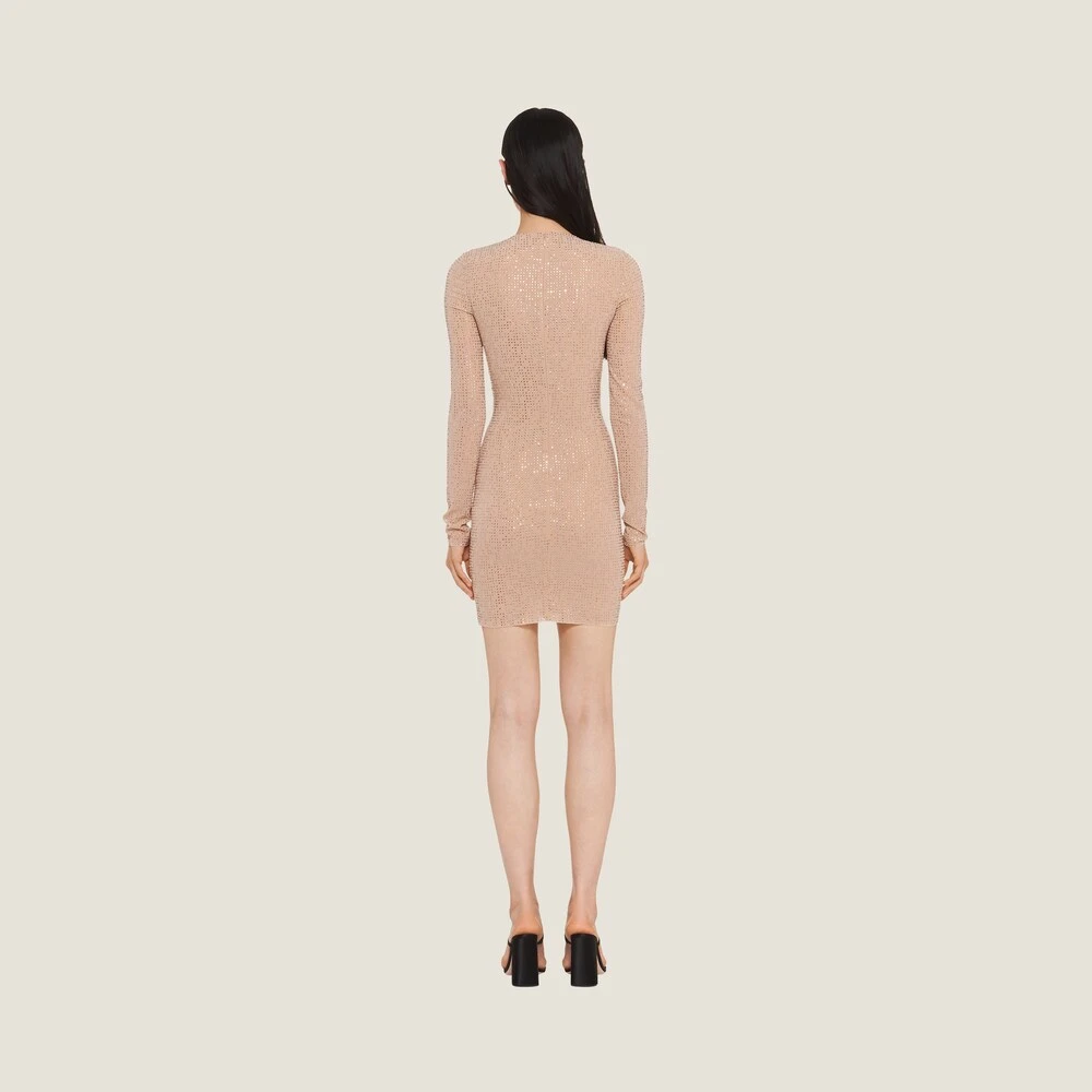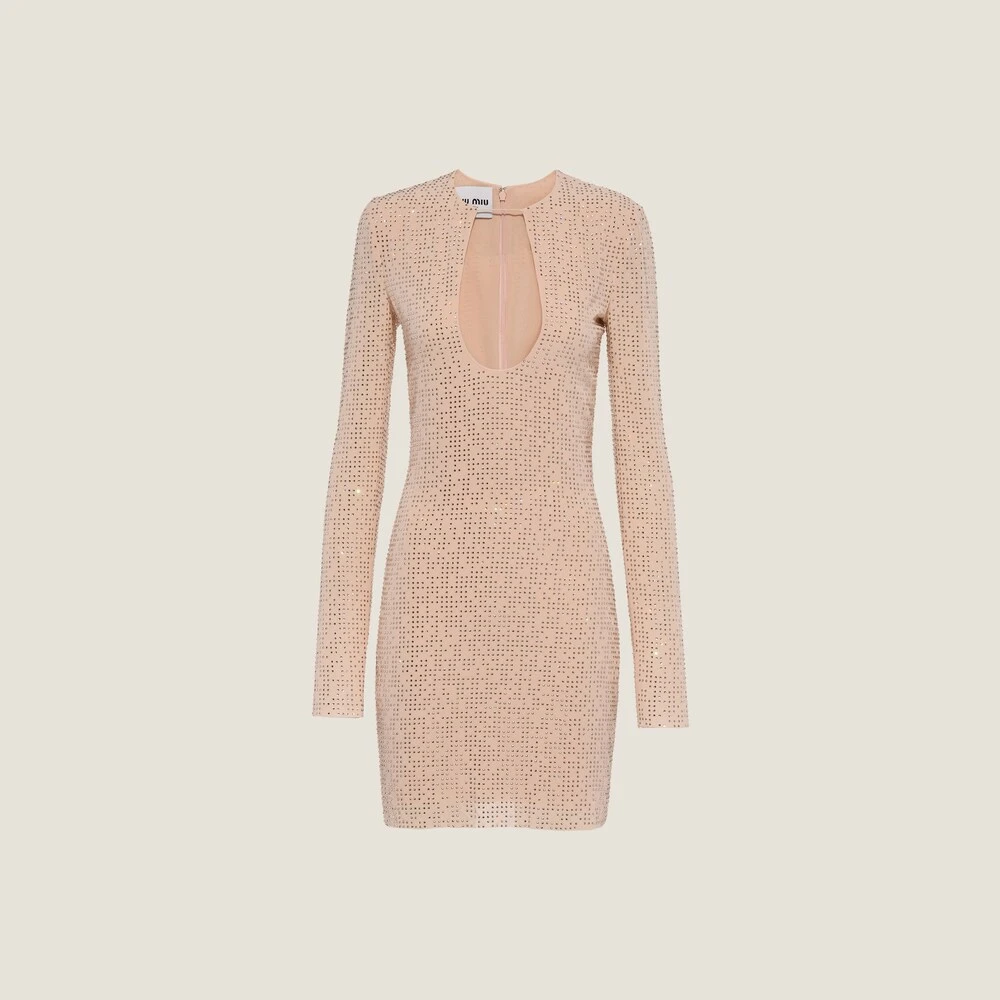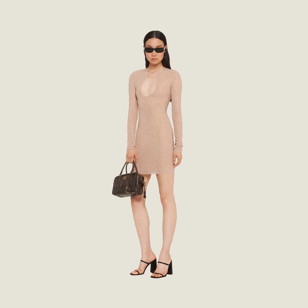 New expressions of femininity take shape as sophisticated designs. Miu Miu reimagines the silhouette of the sheath dress in a stretch version with keyhole neckline.