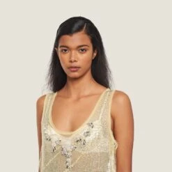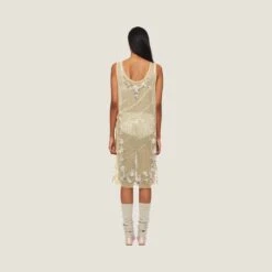 A straight silhouette that pays homage to the Roaring Twenties: this tulle dress reinterprets the classic idea of embroidery with precious details that refer to the floral world. Absolutely elegant, it perfectly blends an industrial and artisanal dimension.