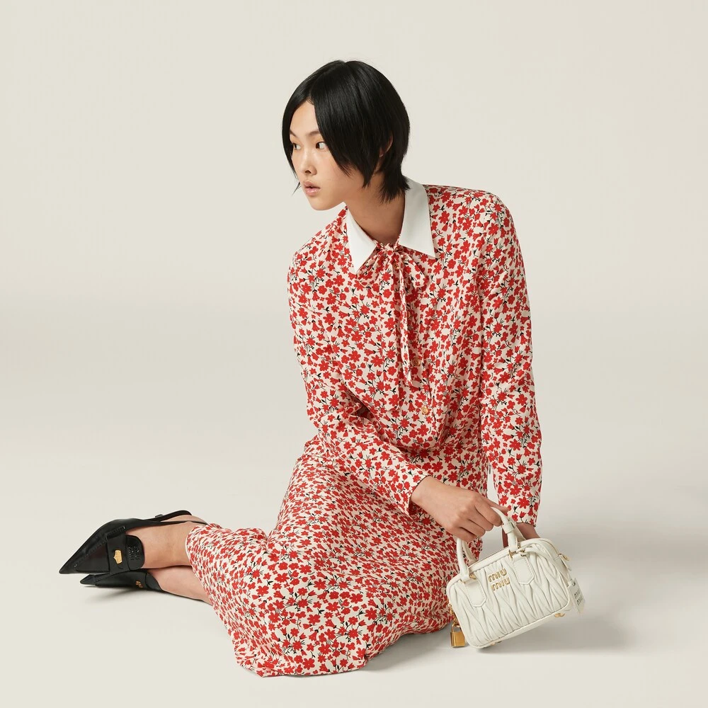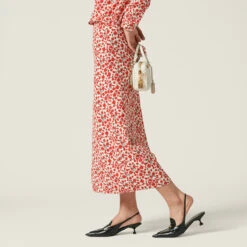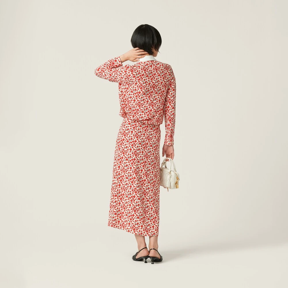 A vibrant, edgy style characterizes this crepe de chine skirt. The floral print with a romantic, playful character enhances the sleek lines and crisp texture of the garment.