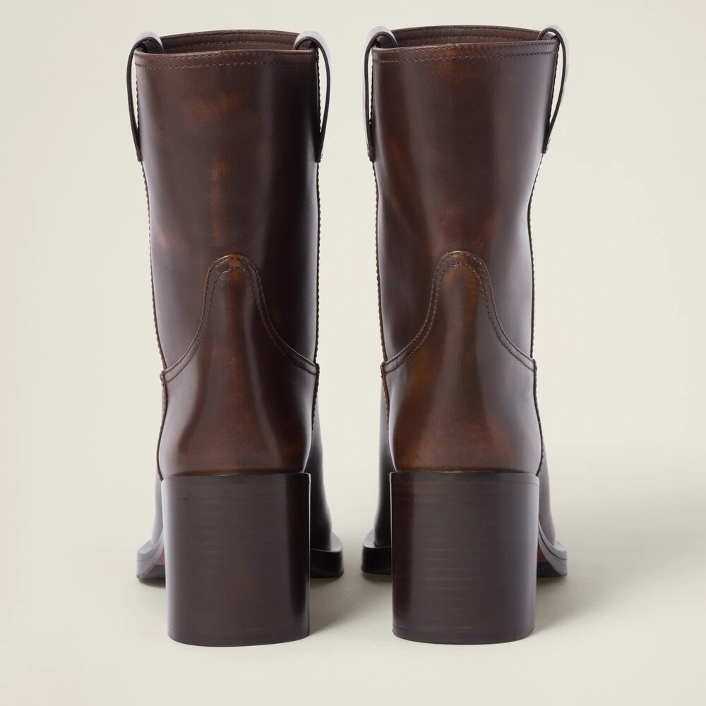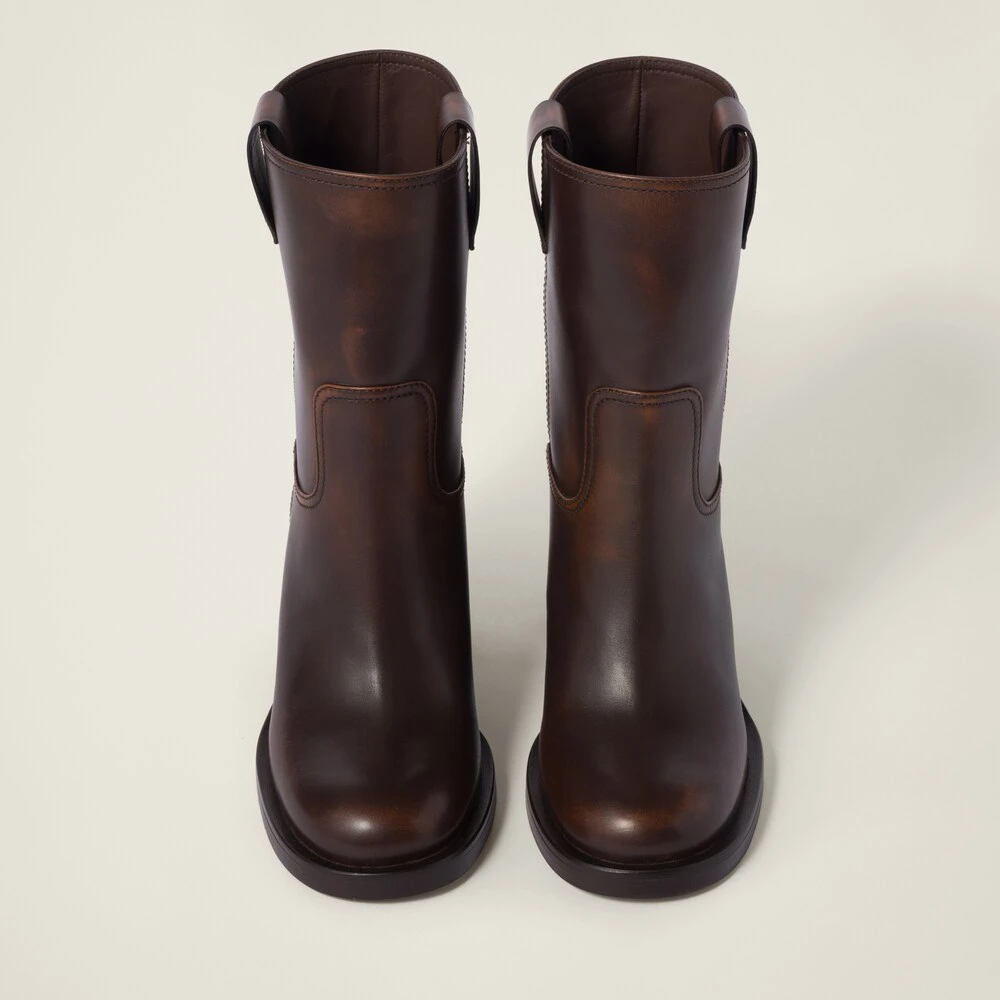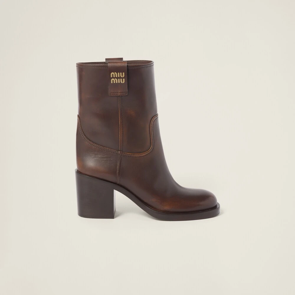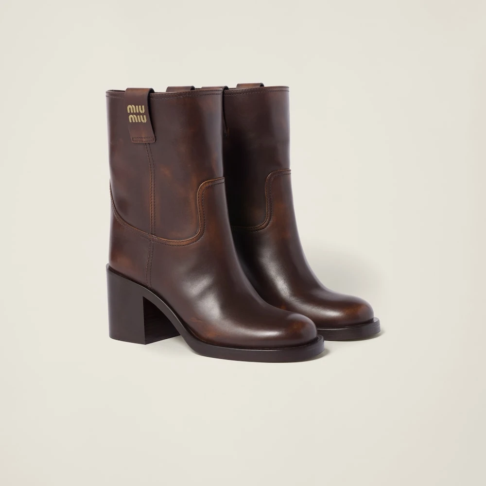 A special two-tone nuanced effect, the result of a sophisticated process that distributes wax in an uneven way, characterizes these leather booties. The Miu Miu logo completes the look with an iconic note.