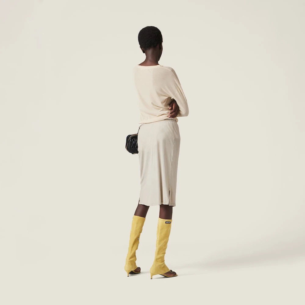 Present on the catwalk during the Spring-Summer 2023 show, the garment-dyed ribbed knit jersey dress expresses a notion of fashion as a means of translating a reaction to current reality into material form. The straight fit and side slits define a distinctly feminine attitude that is both bold and relaxed. The logo patch crosses the boundaries between function and decoration and completes the garment with an iconic note.