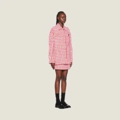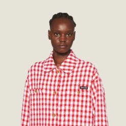 Irreverent, provocative and casual: the look of this new gingham check bouclé blouson jacket is an expression of femininity that needs no labels to define itself. The pattern in the lively shades of the season, gold buttons, and the label patch come together to give the garment unique, fascinating style.
