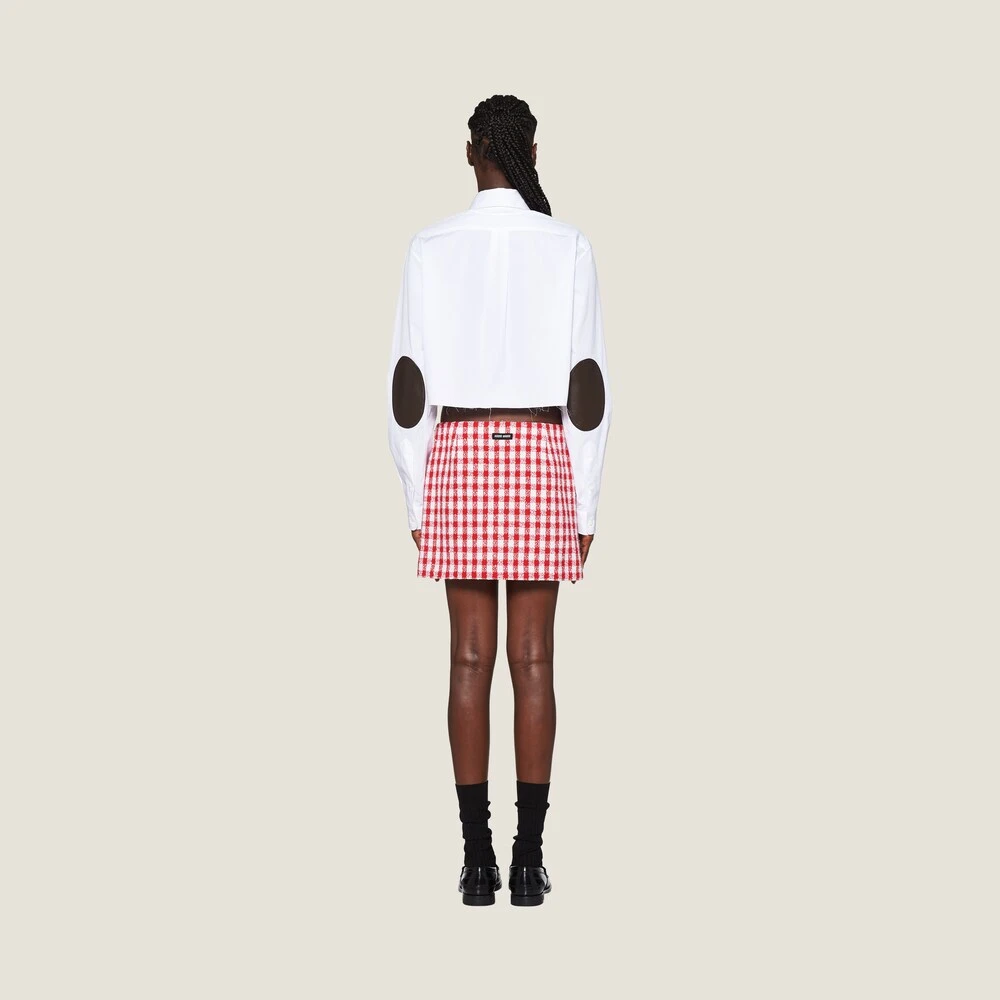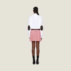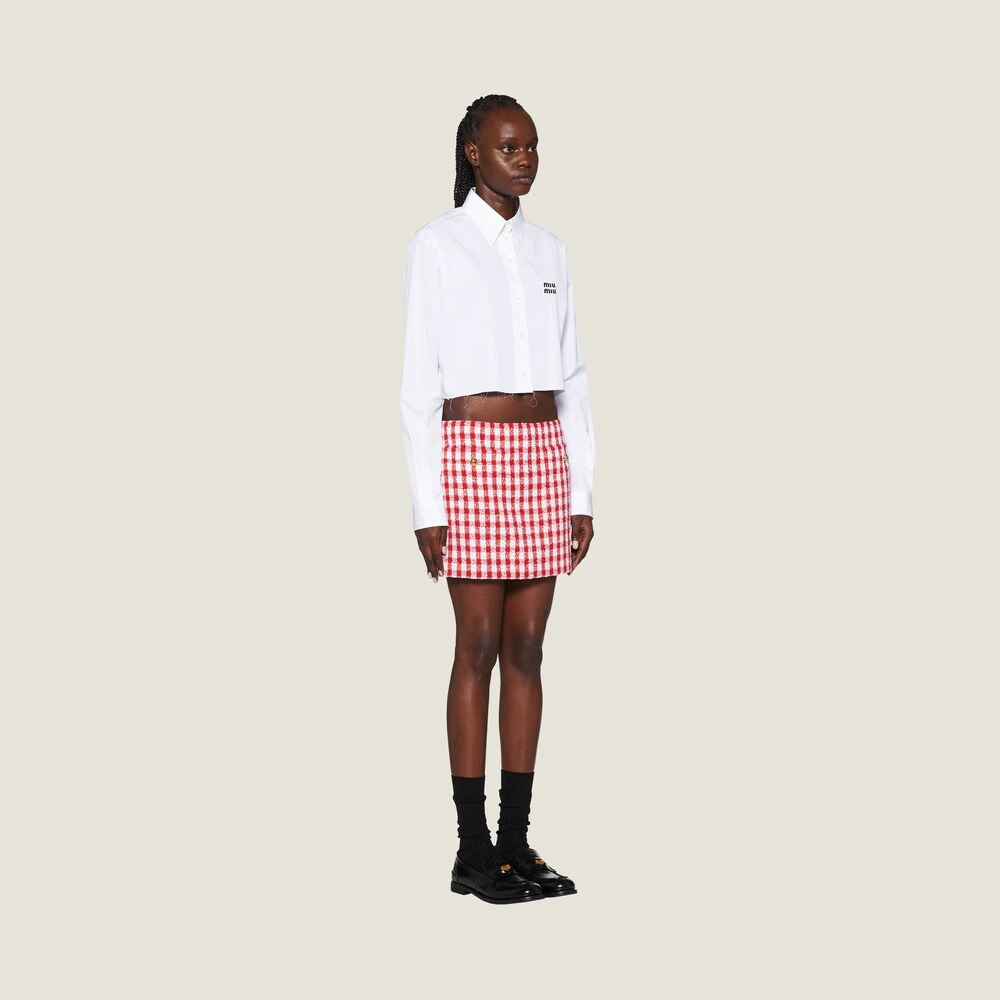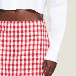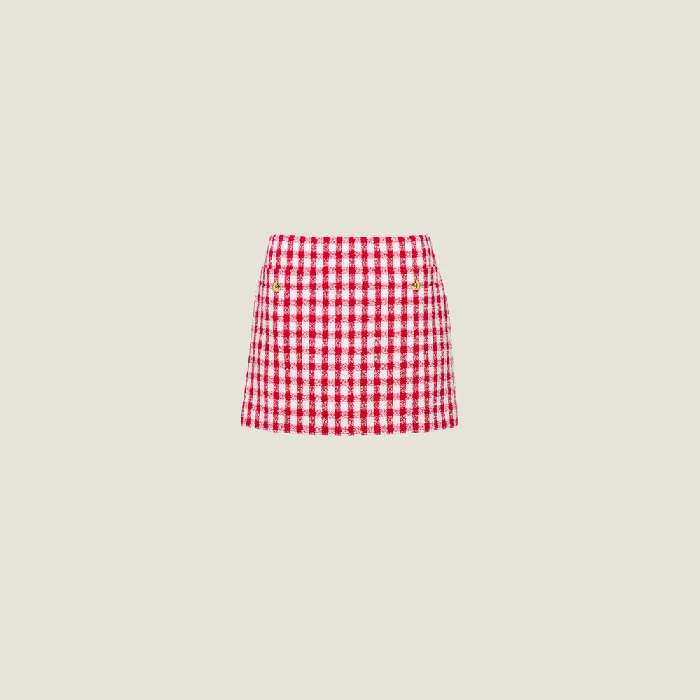 The classic pattern of this gingham check bouclé skirt is given a bold and rebellious yet always refined new look. The contrasting button adds a shiny, feminine touch while the miniskirt silhouette underlines the contemporary attitude of the garment.